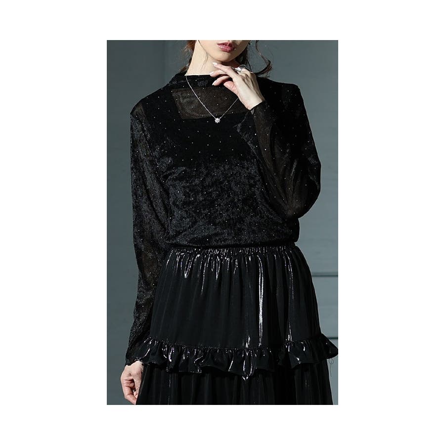 星のように煌めくラインストーンを散りばめたカットソーは、ベロアを重ねたチュール地で大人の肌見せができる一枚。