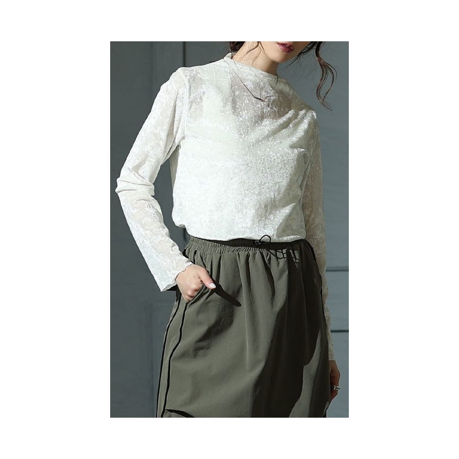 着丈は太ももの付け根にかかるくらいです。首元はボトルネックで余裕がありました。袖は親指が隠れるくらいです。脇グリ身幅も程よい余裕があり全体的にちょうどいいサイズ感でした。伸縮性のあるベロアチュールの生地で肌触りも良かったです。キラキラのラインストーンが散りばめられ女性らしく、メインでもレイヤードでも活躍しそうです。