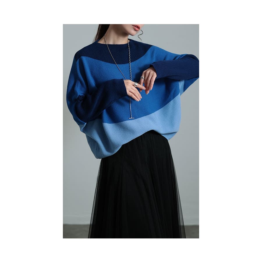 グラデーションのようにブロック配色されたニットは、ドルマンスリーブのシルエットで着るだけ体型カバーが叶う一枚。