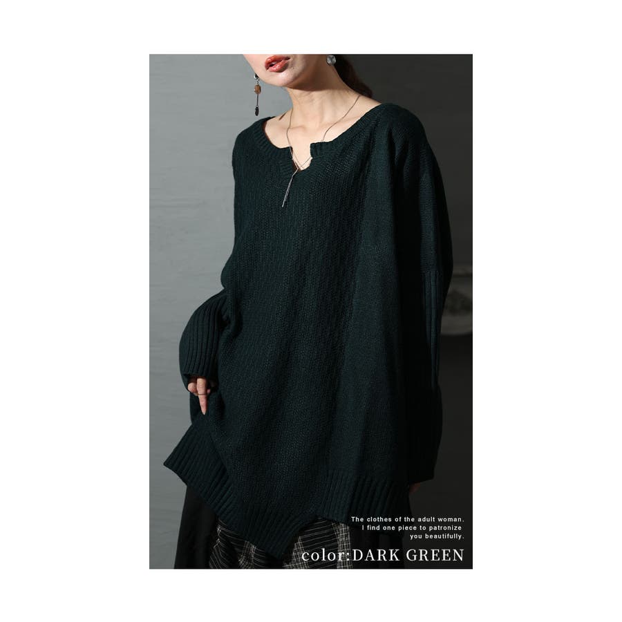 着丈は長い部分は膝上くらい、短い部分は太もも真ん中くらいです。深めのキーネックでデコルテが綺麗に見えます。袖は手が隠れるくらいです。ドロップショルダーで身幅も脇グリも余裕があり楽に着用出来ました。袖が太リブになっていてゆとりがありながらスッキリして見えました。柔らかいニットで温かく肌触り良かったです。