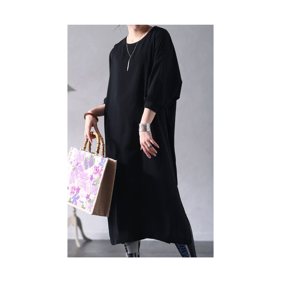 着丈は足首が見えるくらいです。首元は広めのラウンドネックで着脱も楽です。袖は9分袖でラグランデザインなので脇グリも身幅もとても余裕がありました。両サイドにスリットが膝下から入っているので足元が軽やかです。透け感のあるサラリとした生地で肌触り良かったです。シンプルなので小物でアクセントをつけるのがオススメです。