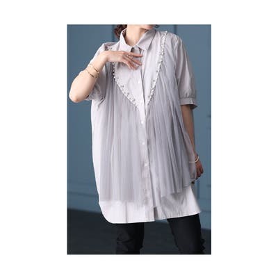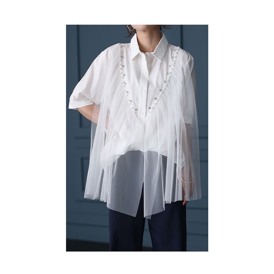 ふわりと踊るチュールが重ね着風にデザインされ、煌めくビジューとパールがお顔まわりを華やかにしてくれるシャツチュニック。