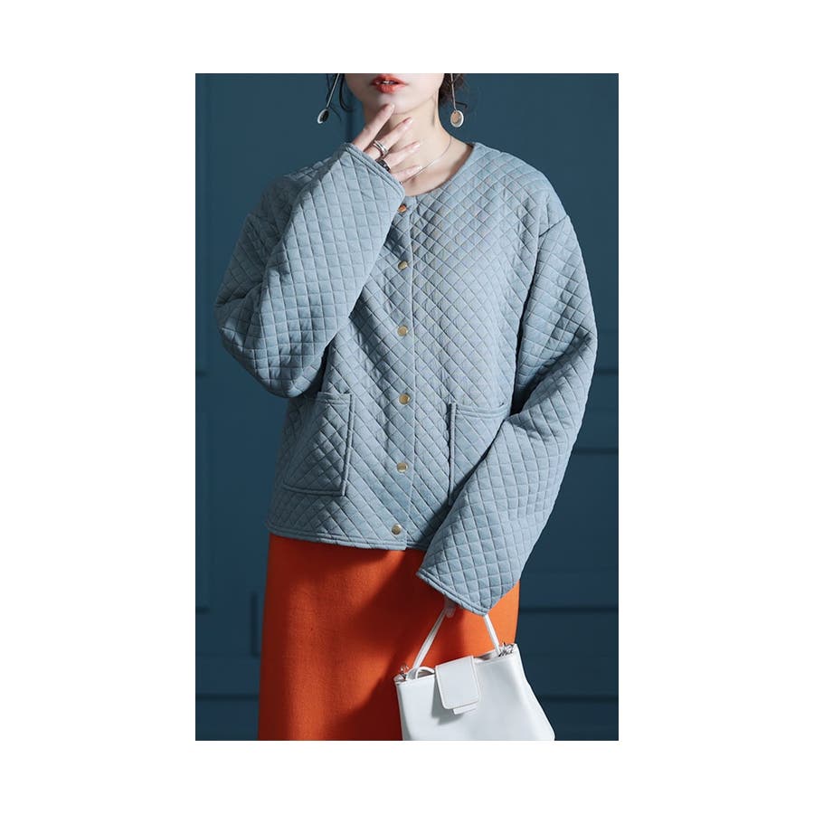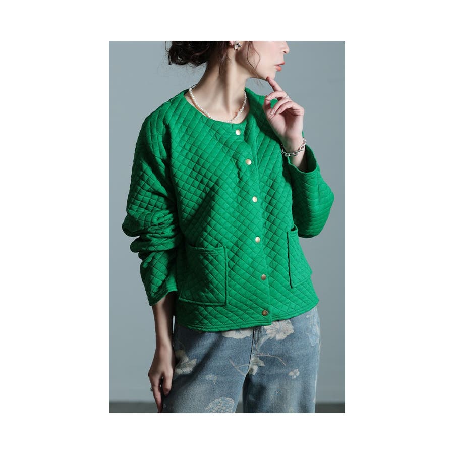 ノーカラーデザインでお顔周りをすっきりさせ、レイヤードスタイルにもぴったり。丸みを帯びたクルーネックが柔らかな雰囲気を纏います。上品見えさせてくれるキルティング生地が大人スタイルにもぴったり。
