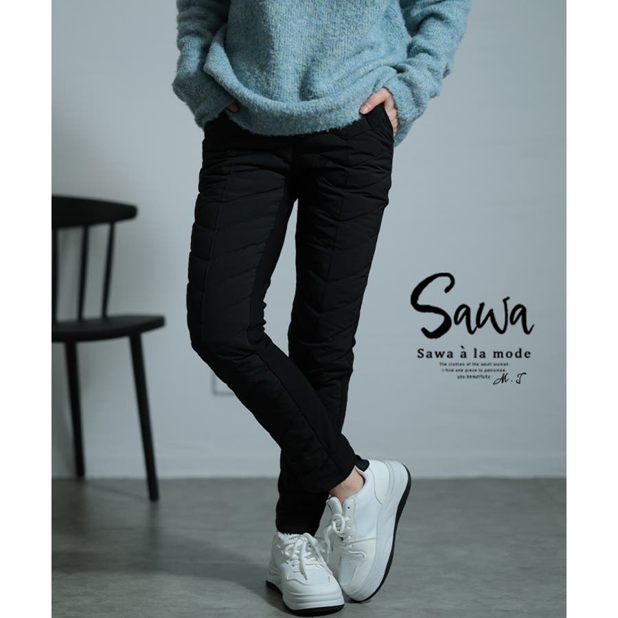 異素材がドッキングしたキルティングパンツは、ダウン&フェザー入りであったかな穿き心地。