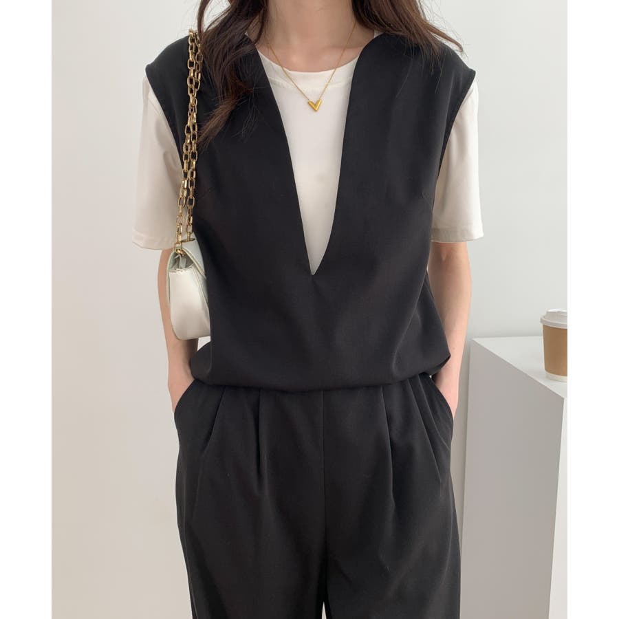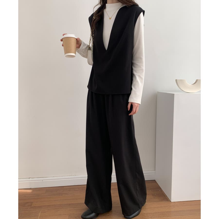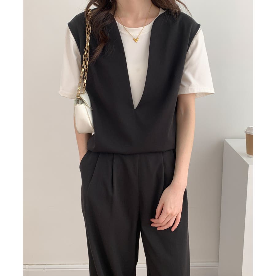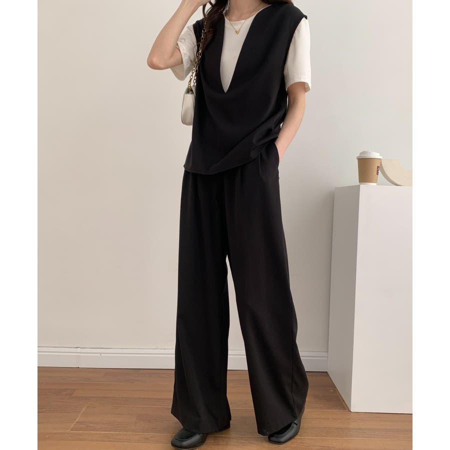 【ブラック】スキッパネックノースリーブブラウス&ウエストタックセミワイドパンツセットアップ