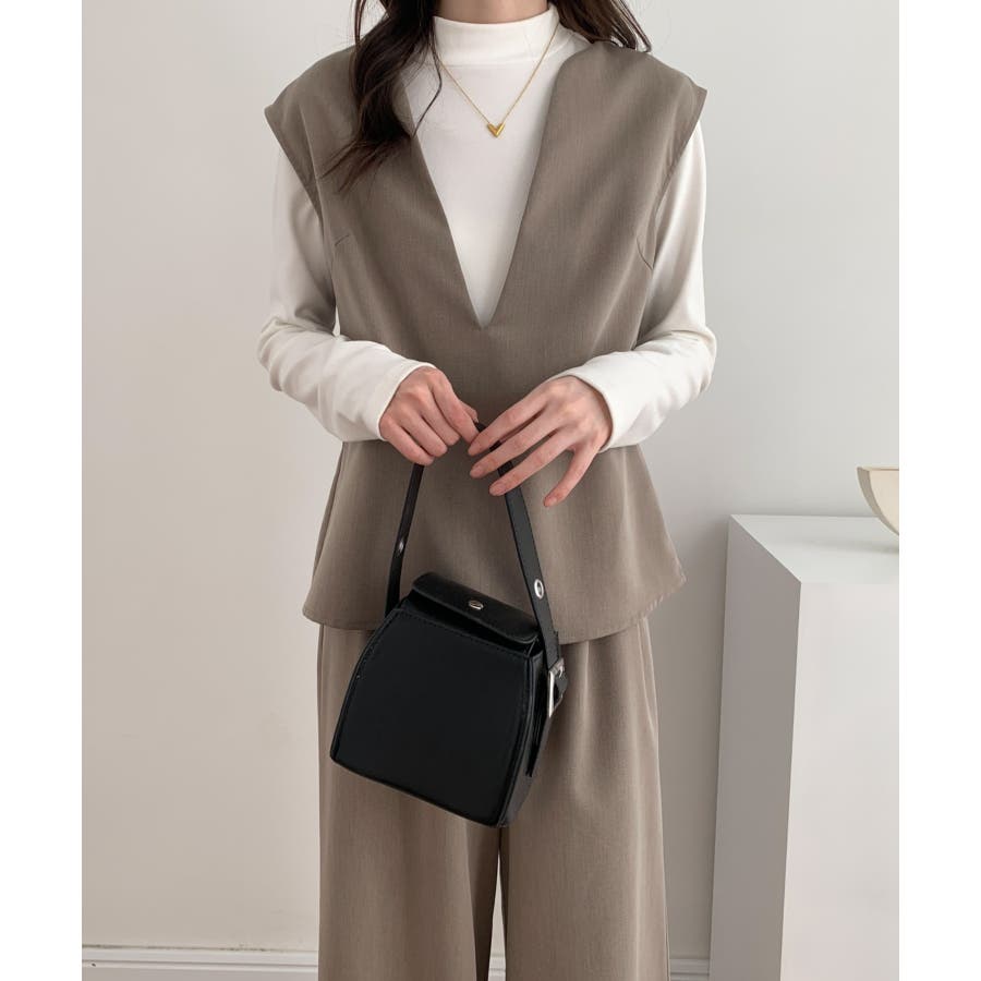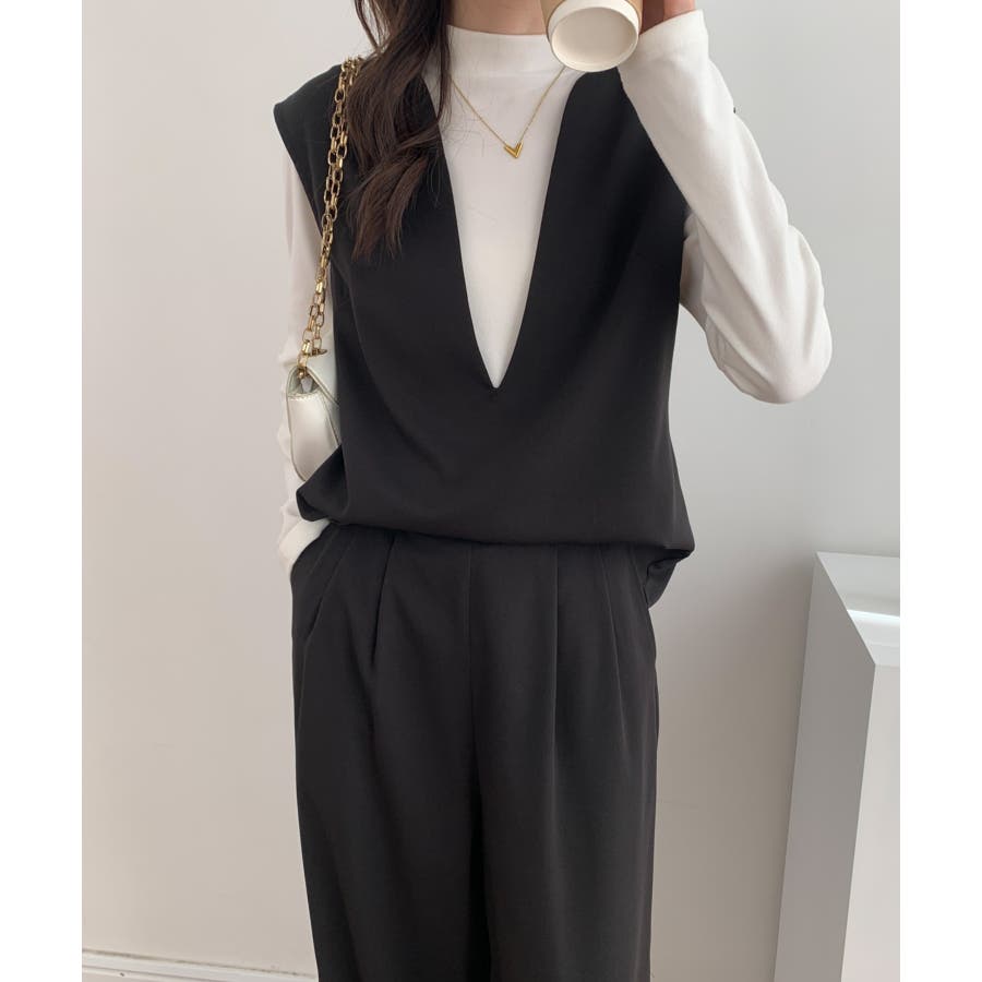 ブラウスは深めのV開きなのでインナーにカットソーやハイネックニットを重ねて、