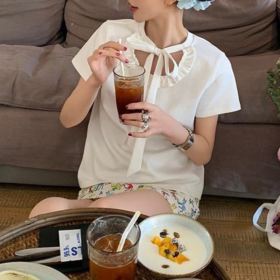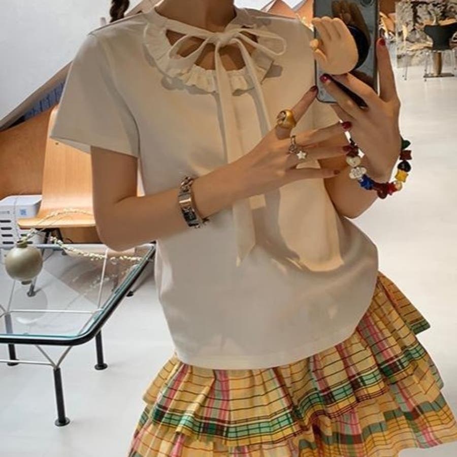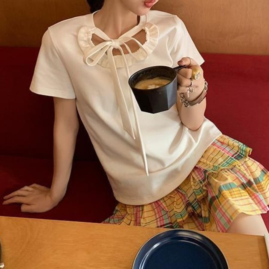襟元のタイはリボン結びでキュートに可愛いフェミニンコーデに、