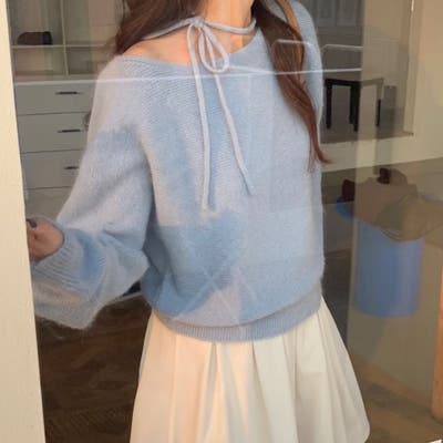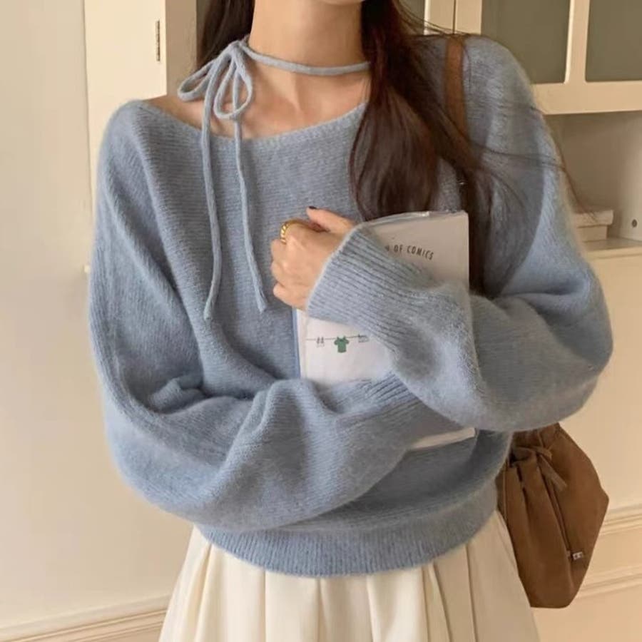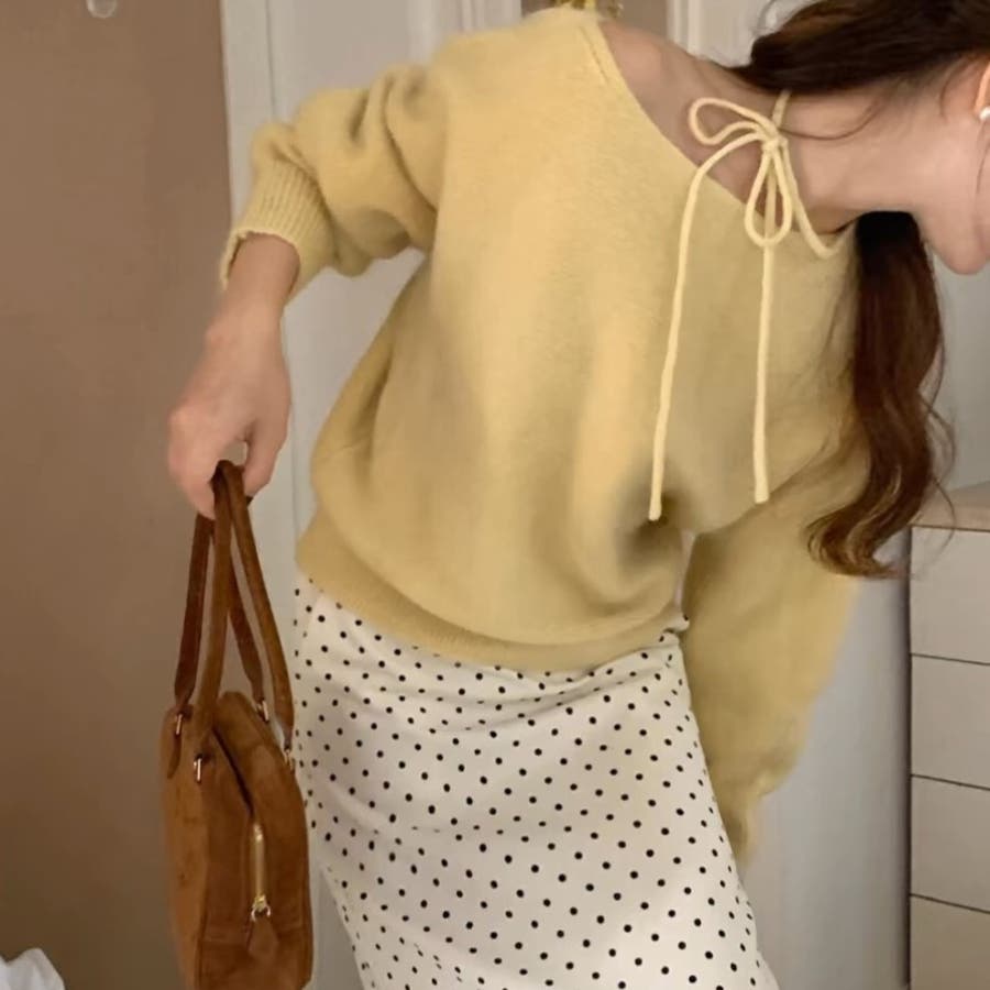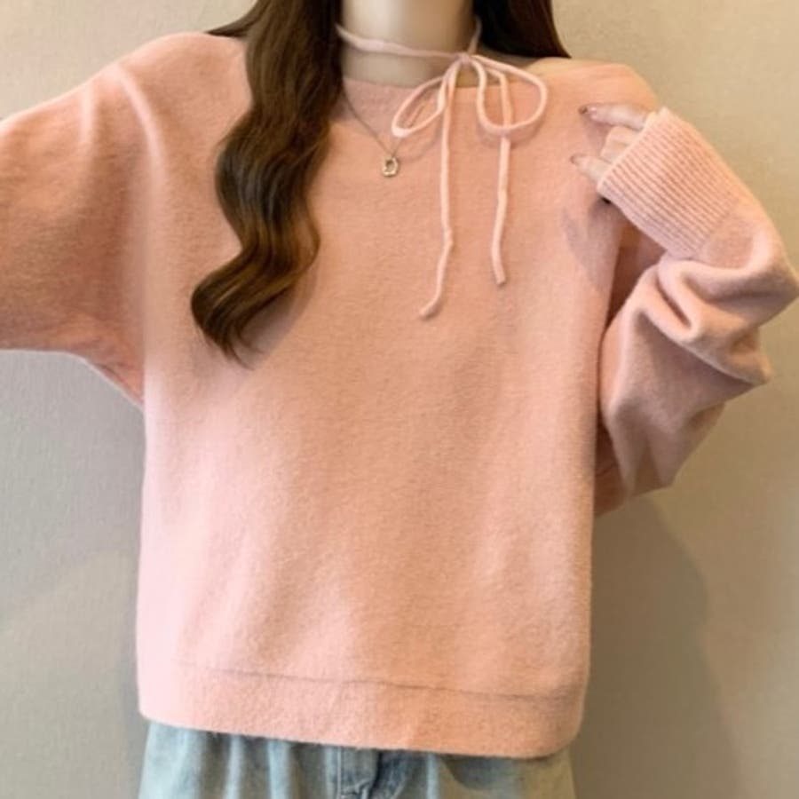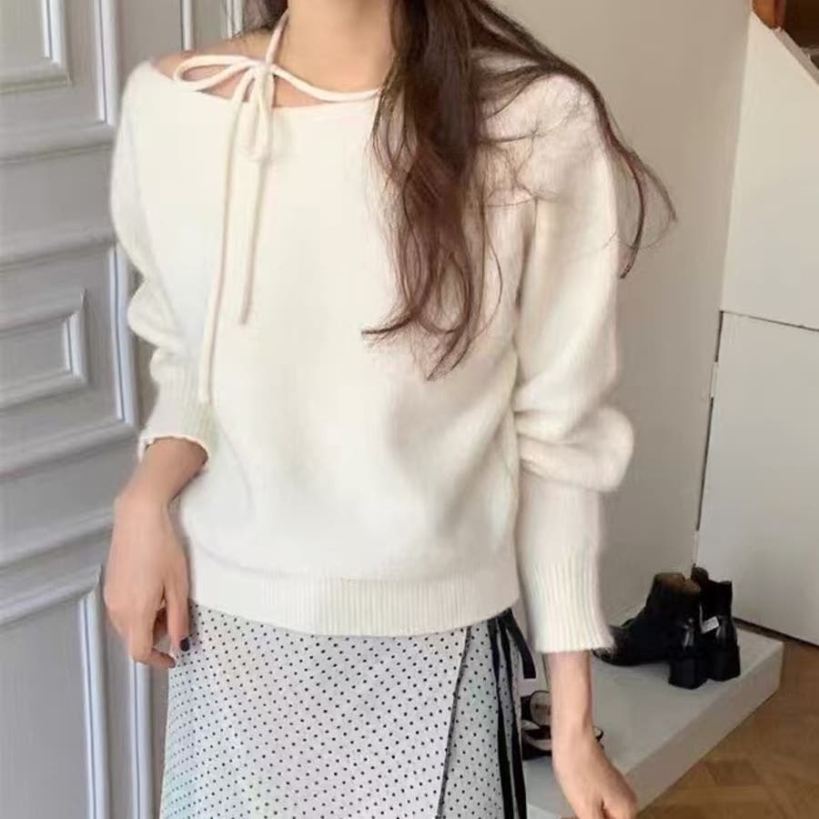 首元にリボンを施し目を引く華やかなデザインニット。