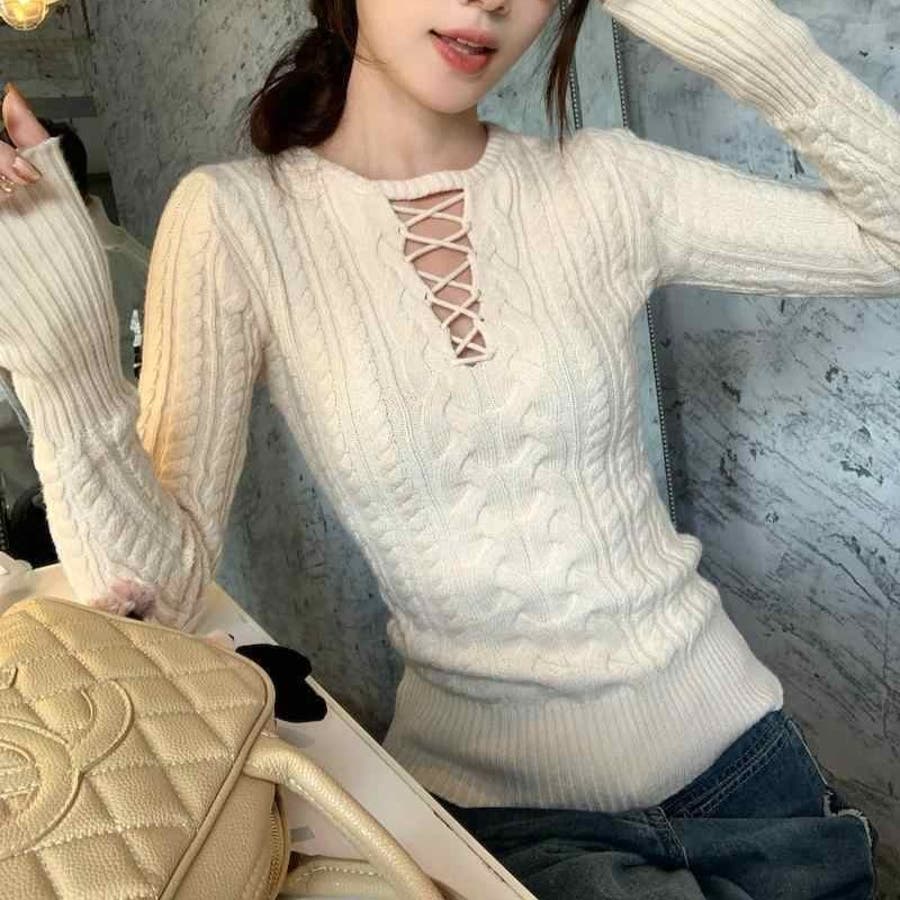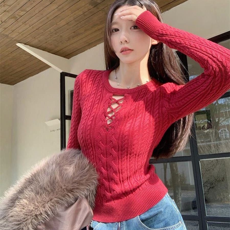 レースアップケーブルニットプルオーバー