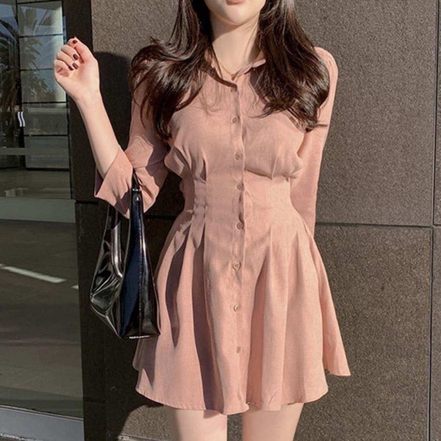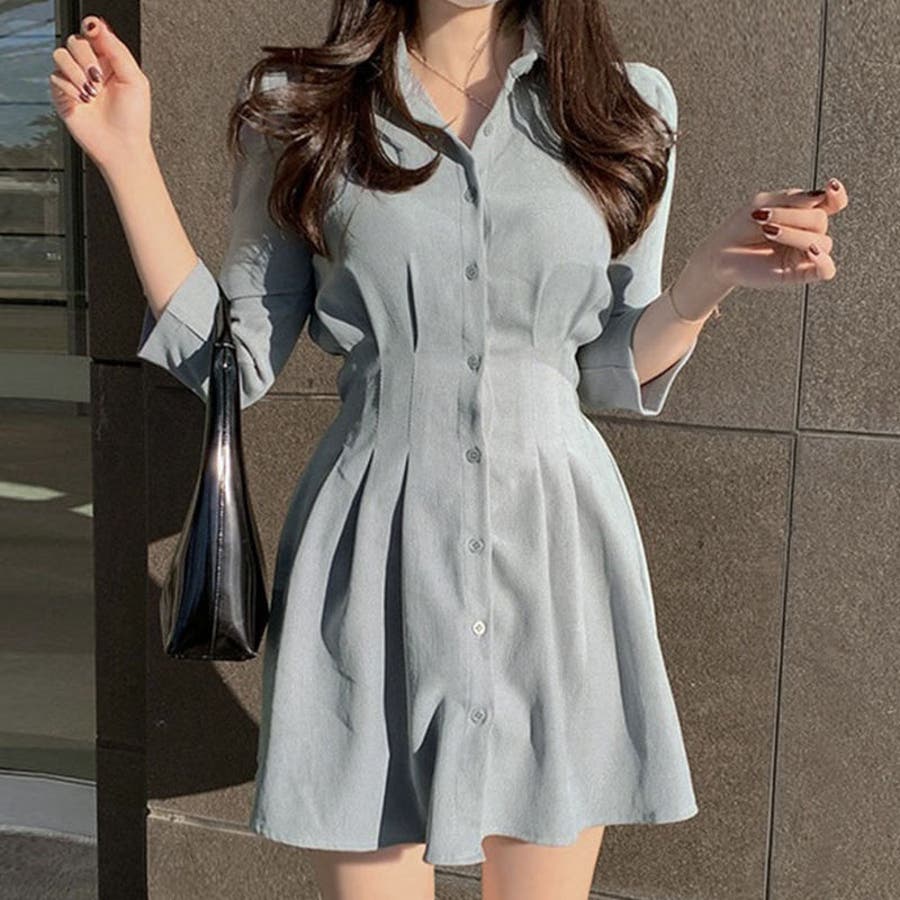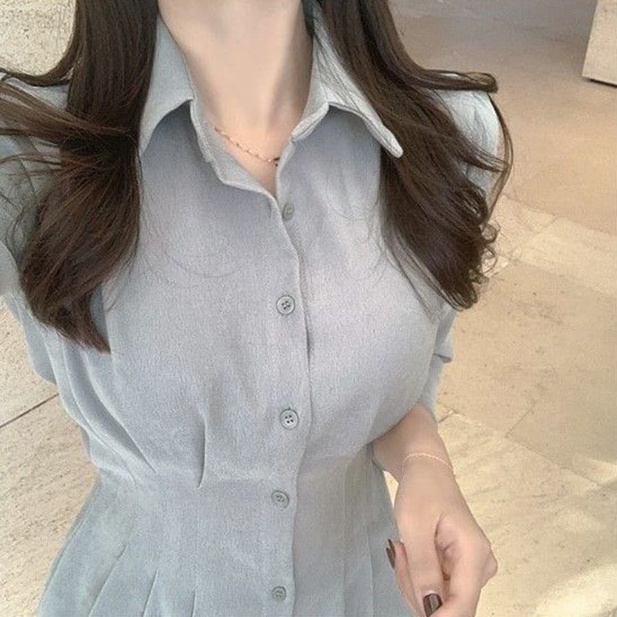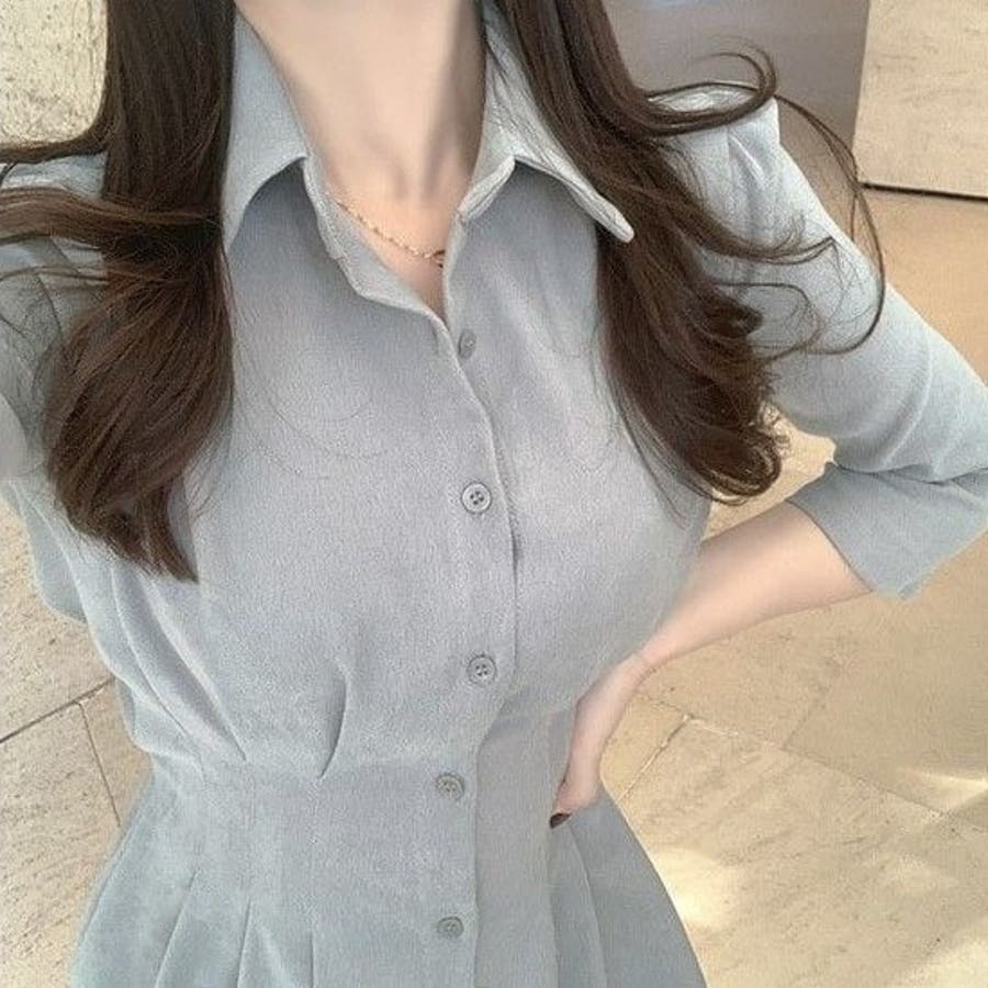 ボタンダウンのシャツスタイルで、胸元から裾にかけてゆるやかに広がるAラインシルエットが女性らしい魅力を引き出します。