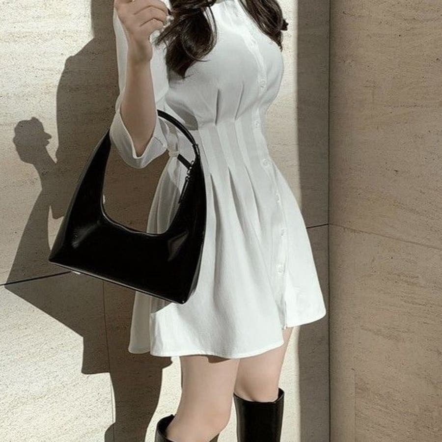 Aラインシャツワンピースは、そのシンプルなデザインのおかげで、様々なスタイリングに合わせやすくなっています。