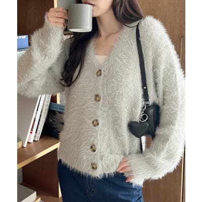 シャギー Vネック マーブルボタン ルーズ カーディガン