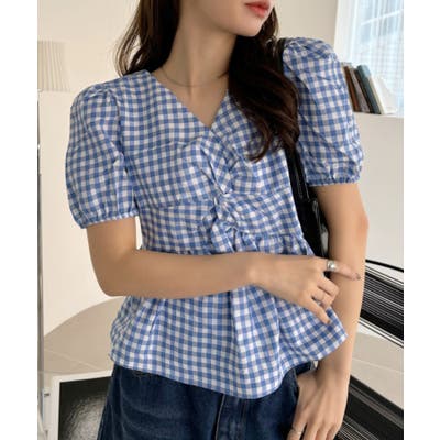 【王道ギンガムチェック♡ フロント ねじりデザイン パフスリーブ ギンガムチェック ペプラム ブラウス】