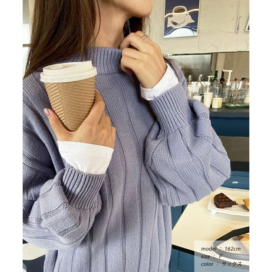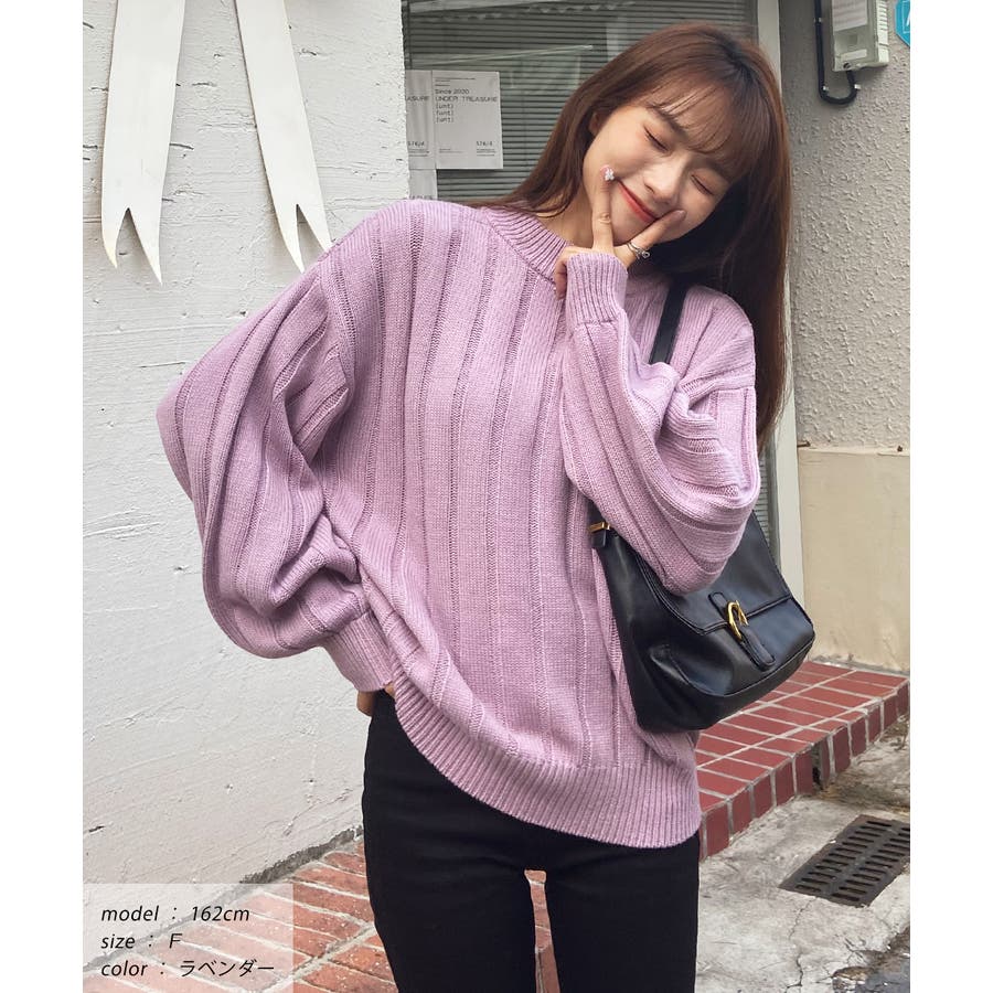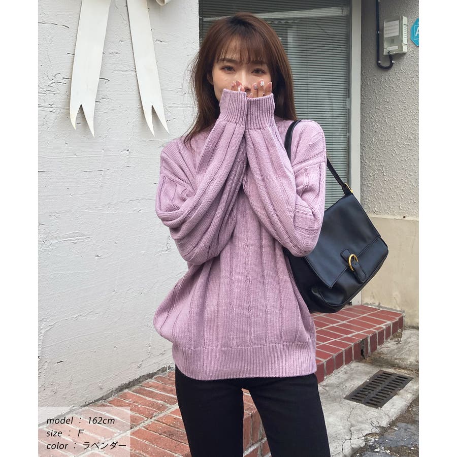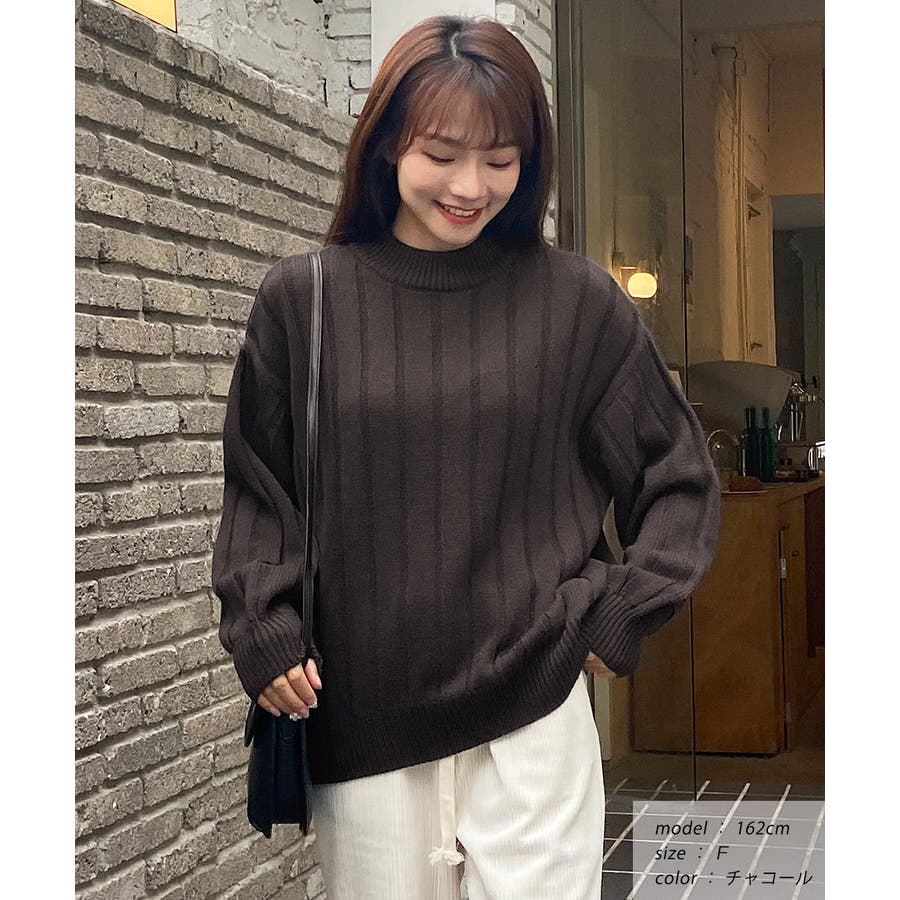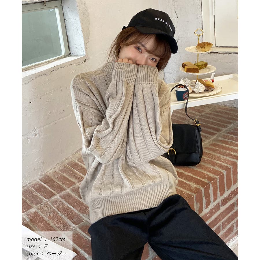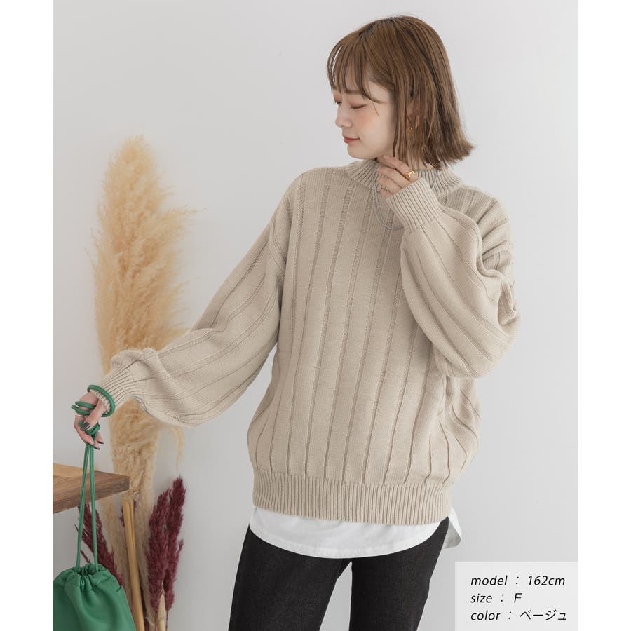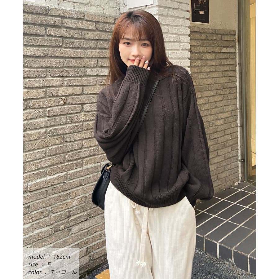 ゆったりシルエットながらもフェミニンな印象の太リブニット
