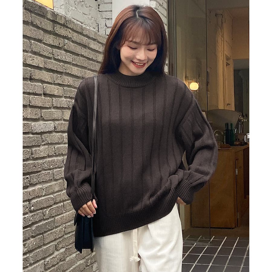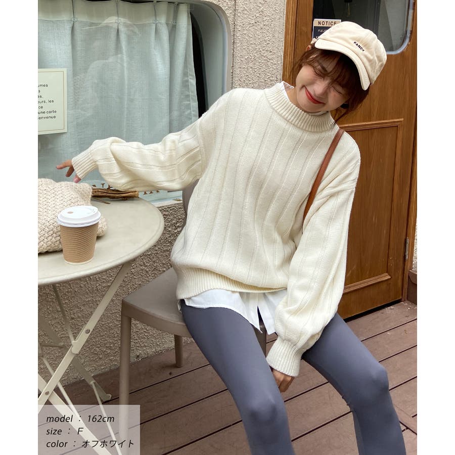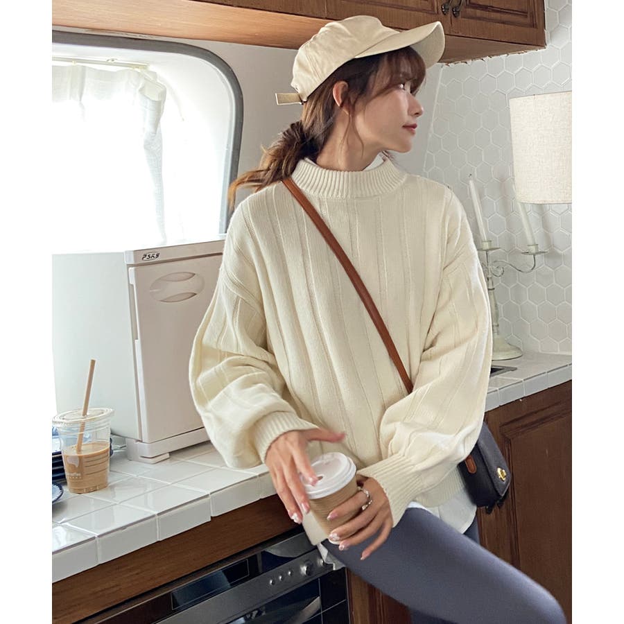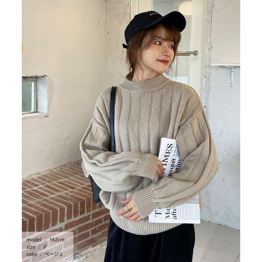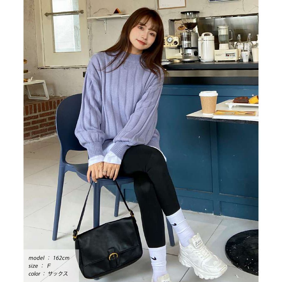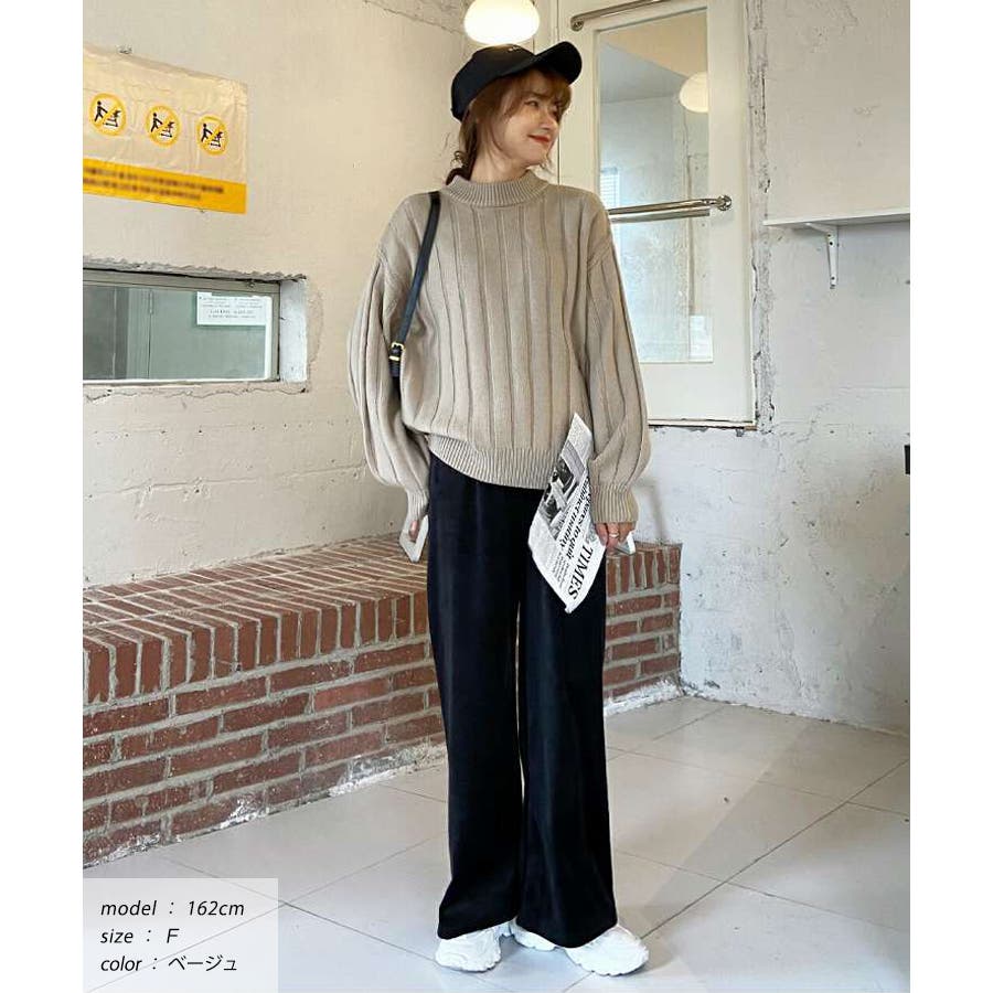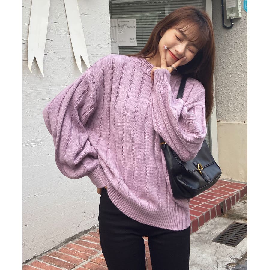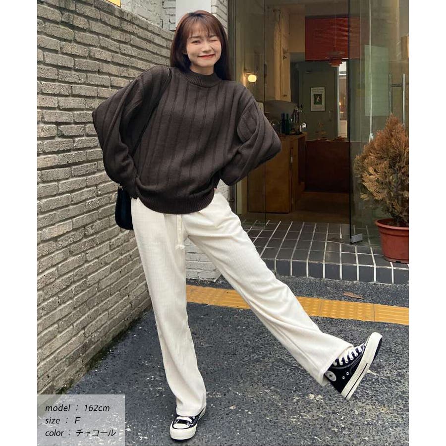 ゆったりシルエットながらもフェミニンな印象の太リブニット
