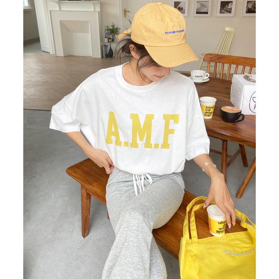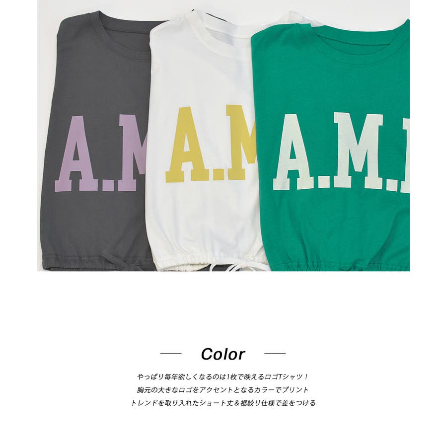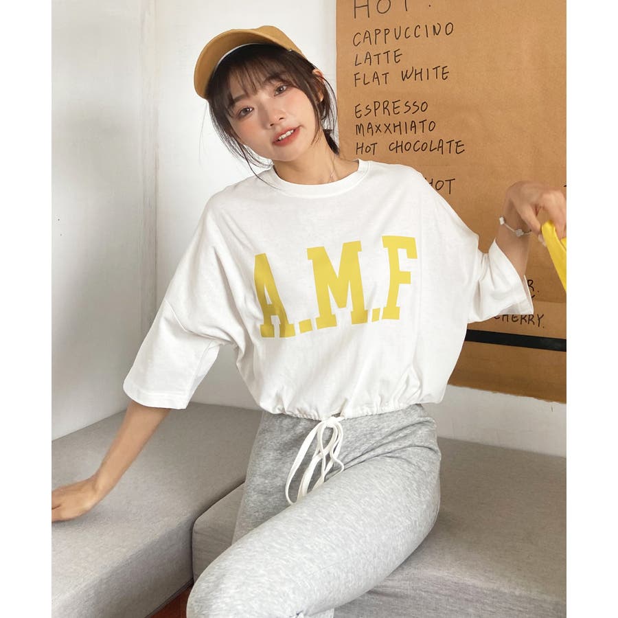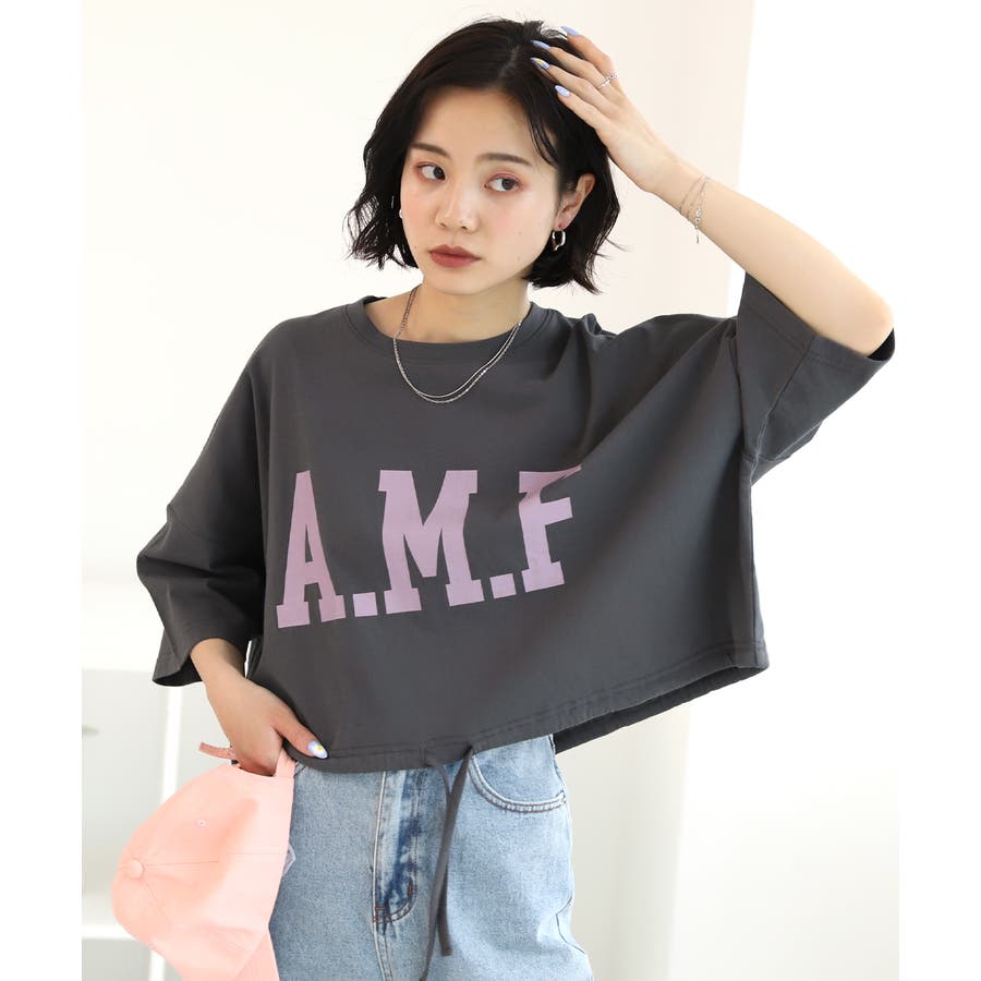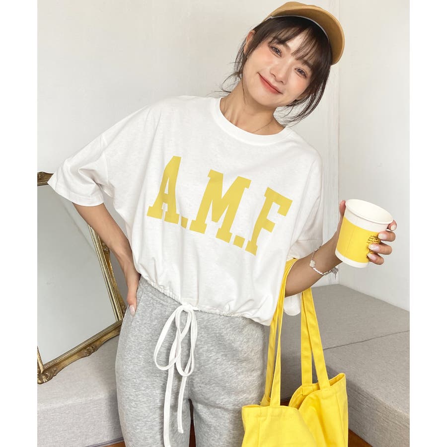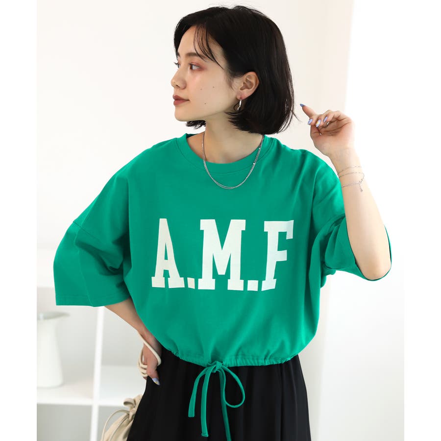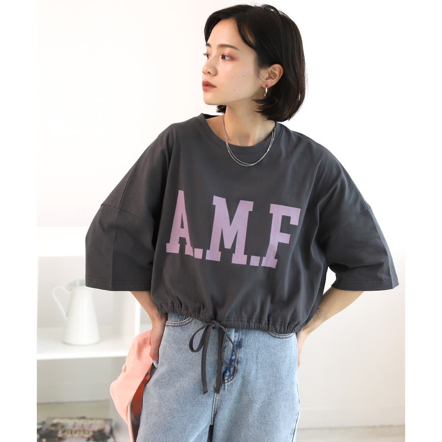 ショート丈プリントTシャツ A.M.F 裾絞り ギャザー ロゴ
