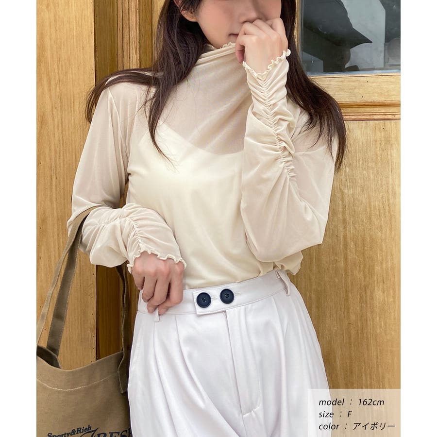 抜け感のあるメローディテールのネックラインや袖口のギャザーがポイントに!
