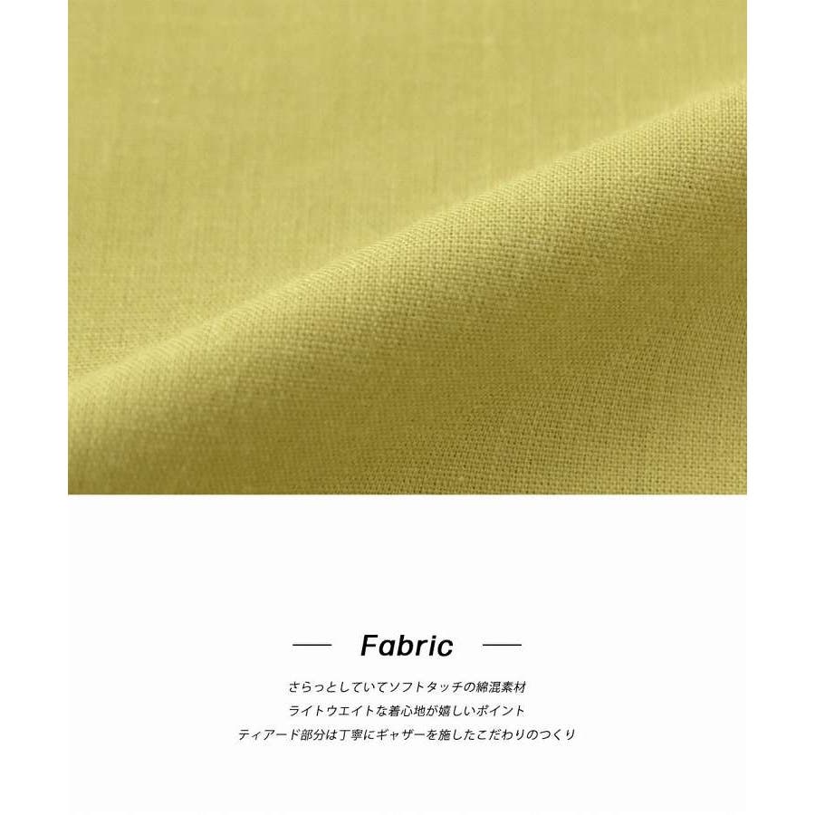 首まわりに寄せたギャザーや裾の切り替え位置など、ディテールにもこだわった1枚