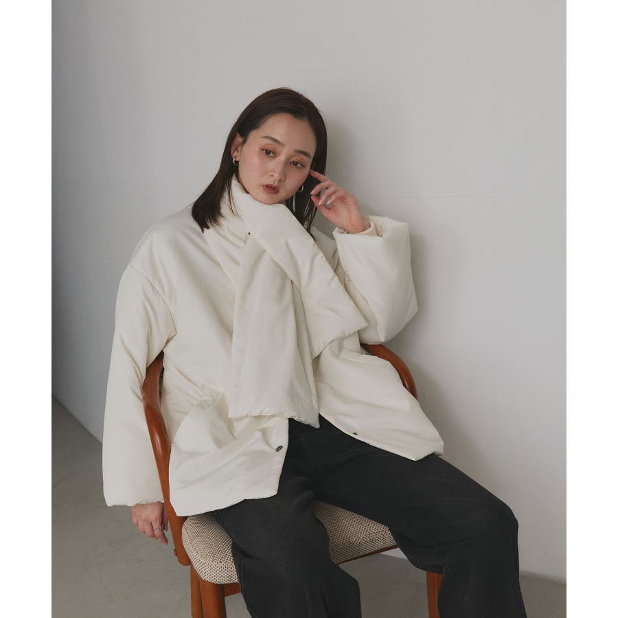 ふわふわ軽くて暖かいマフラー付きノーカラーダウンジャケット!