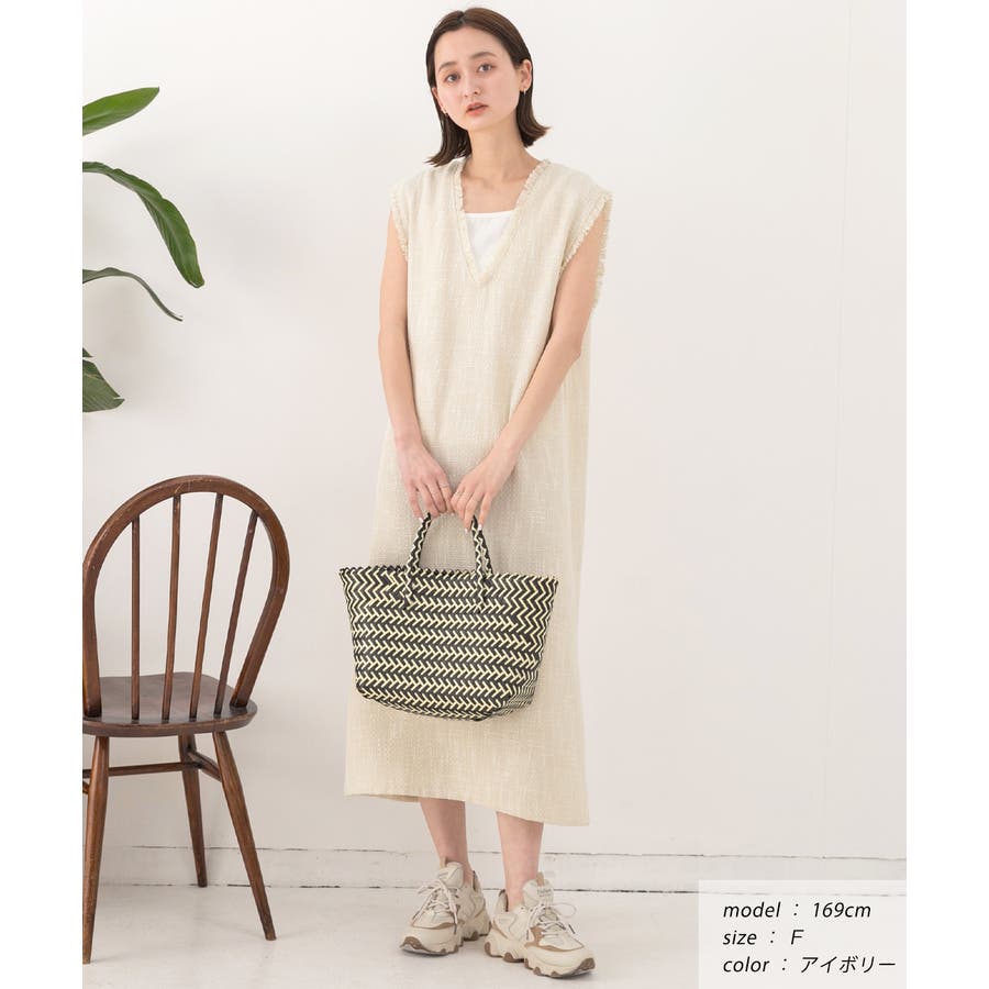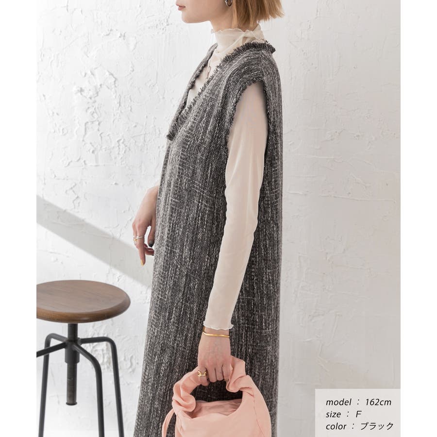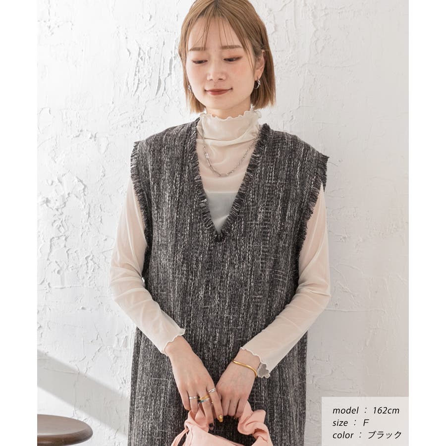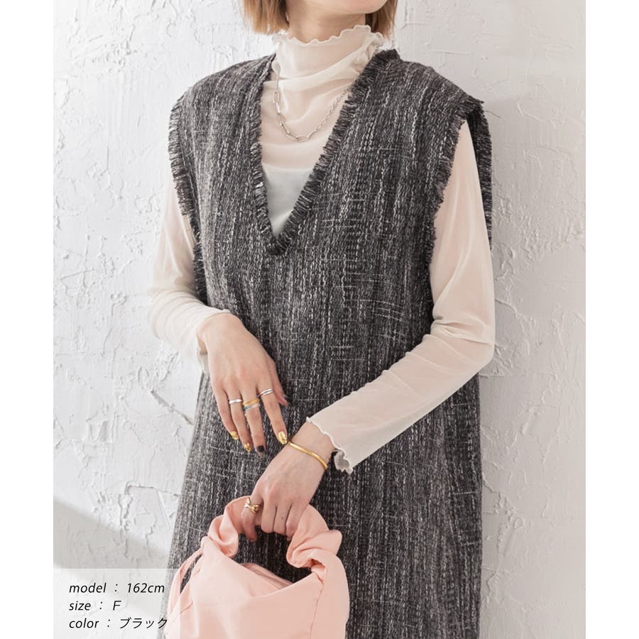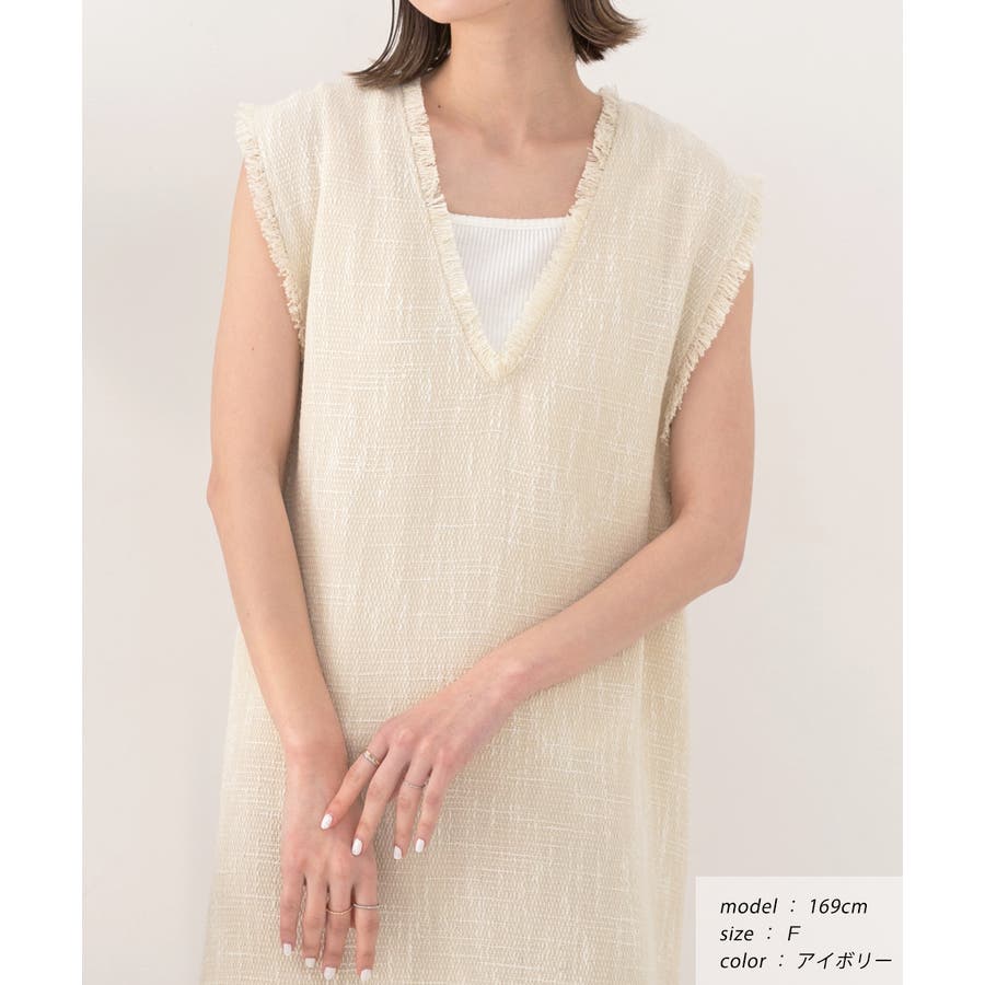 すっきりした深めのVネックで、フリンジが上品なこなれ感を演出してくれます