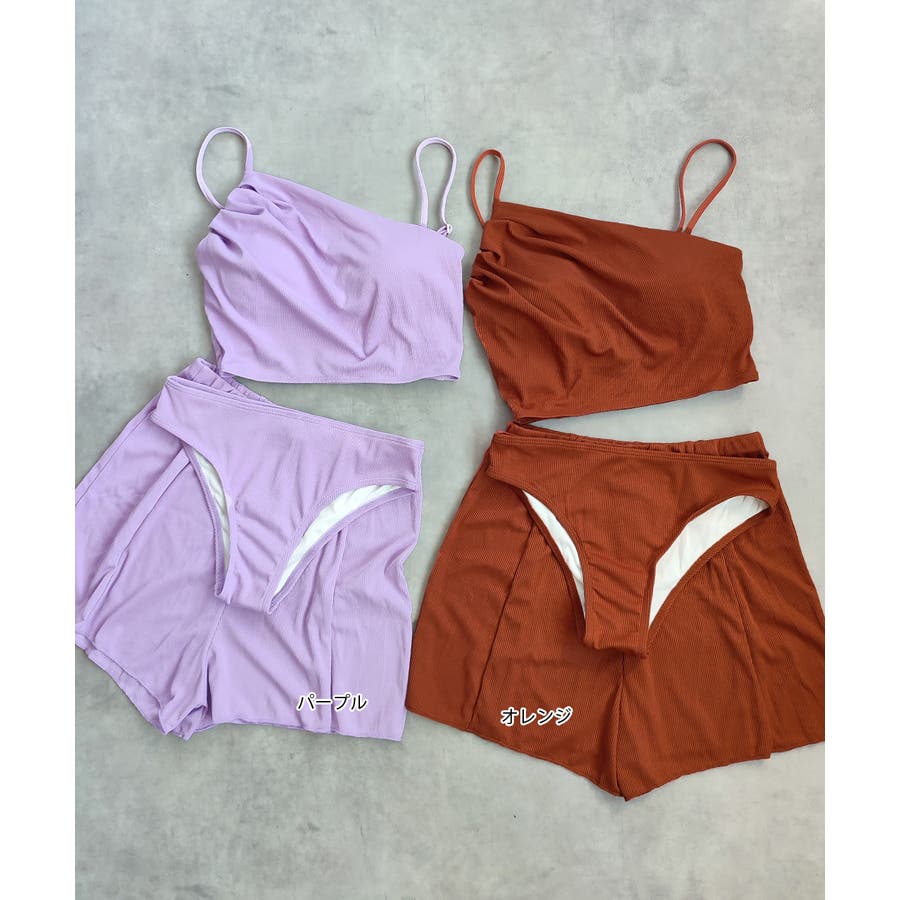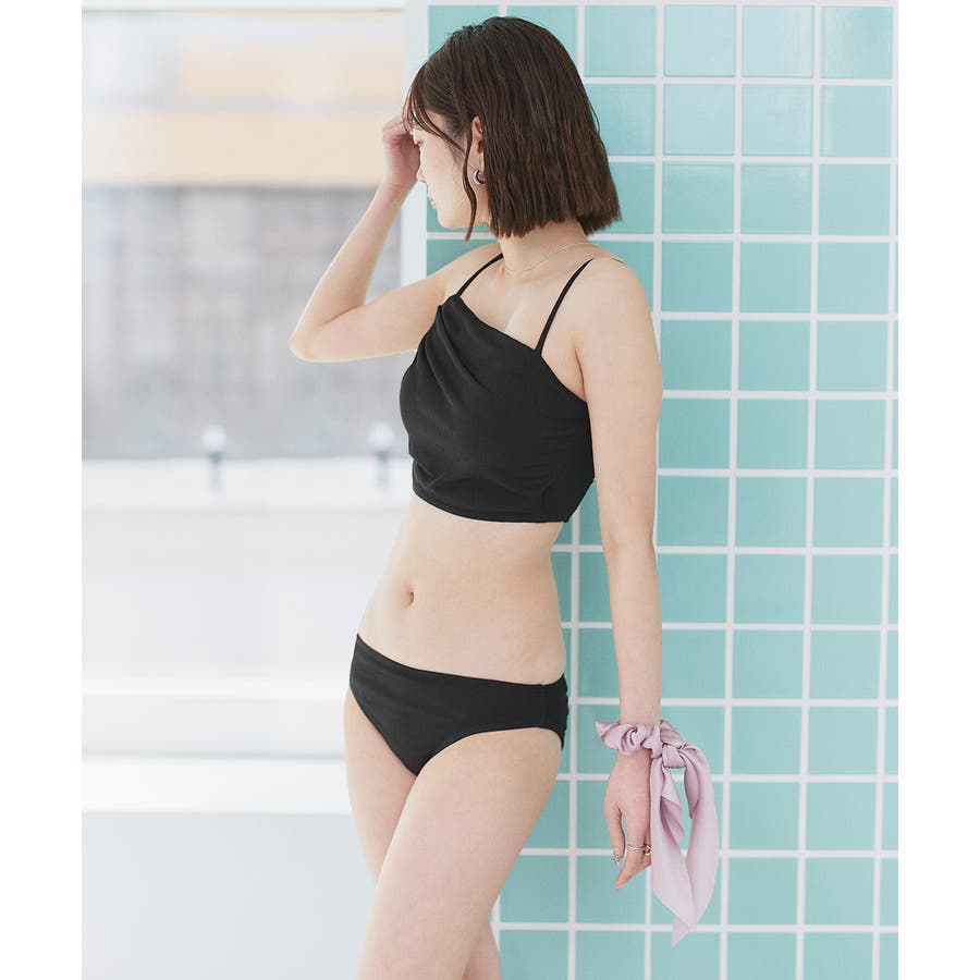 リブ素材スイムウェア3点SET アシンメトリーギャザーデザイン