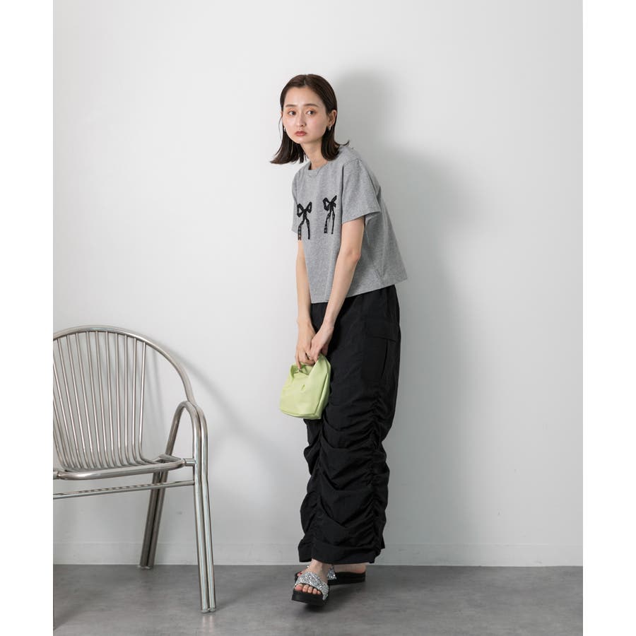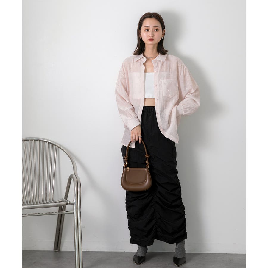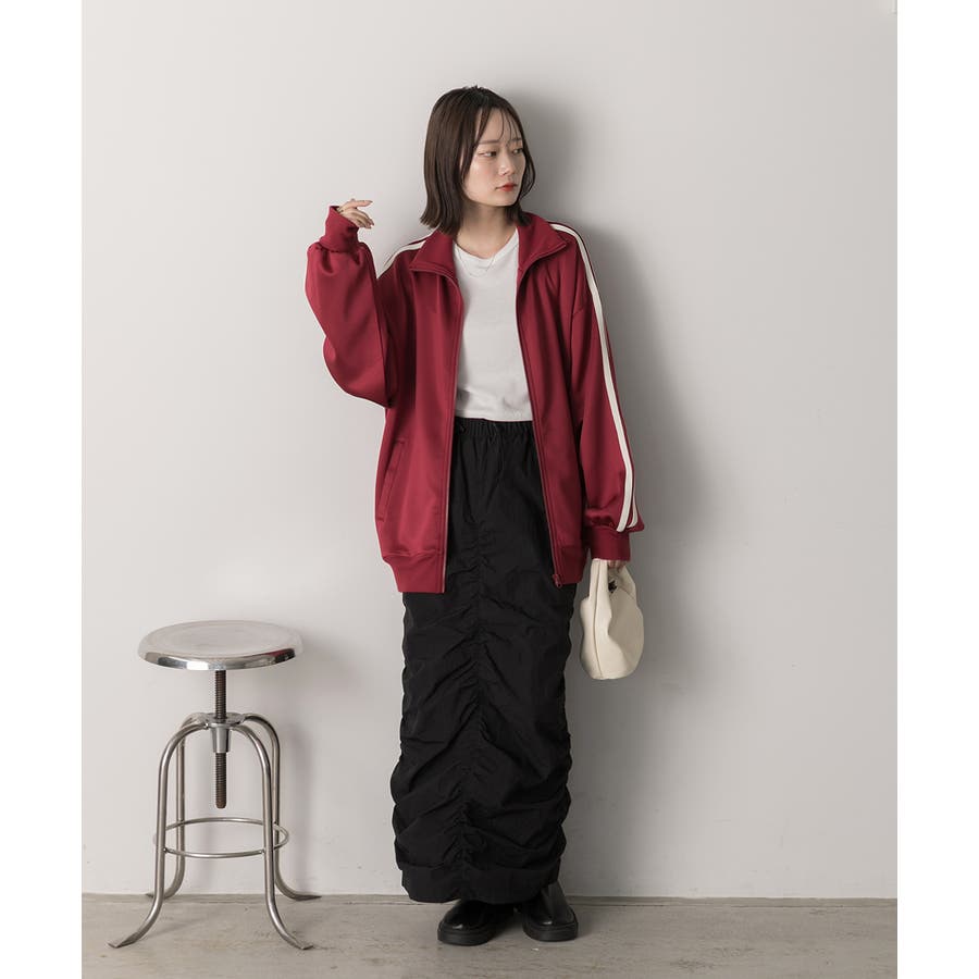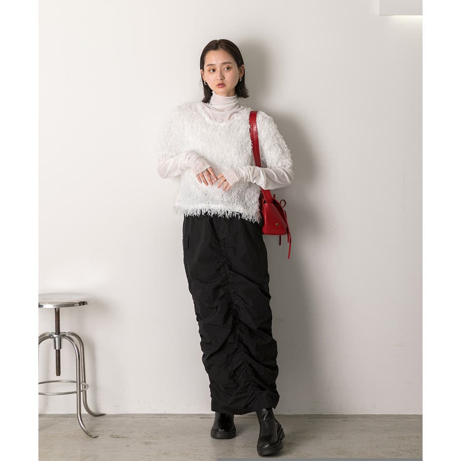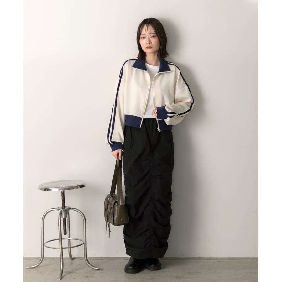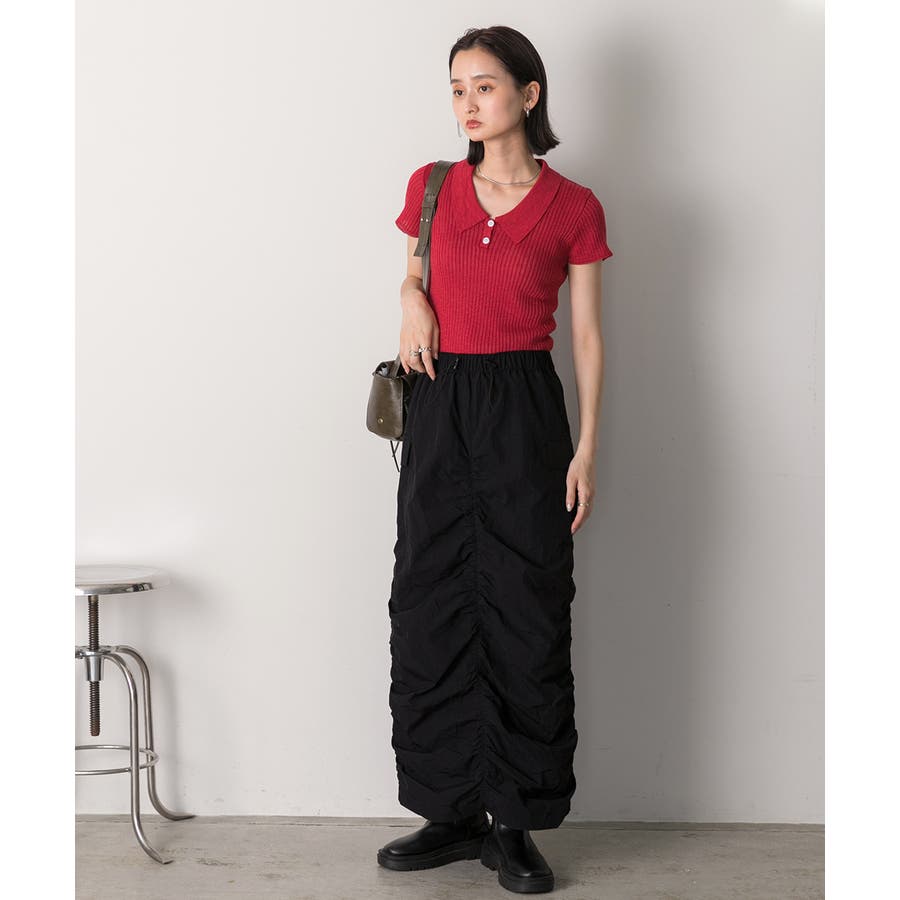 カジュアルに見えがちなナイロン素材ですが、たっぷりのギャザーでカジュアルな中にもエレガントさを兼ね備えた美シルエット