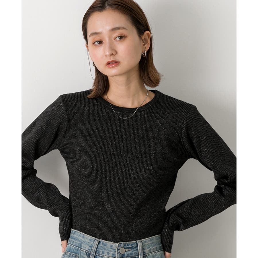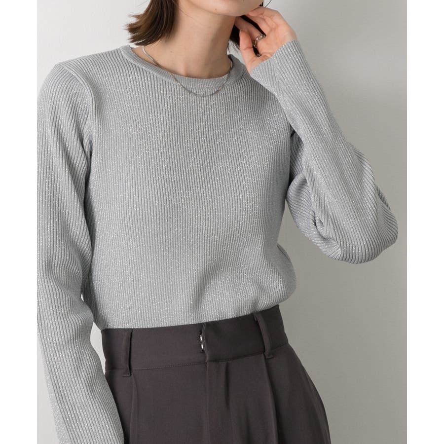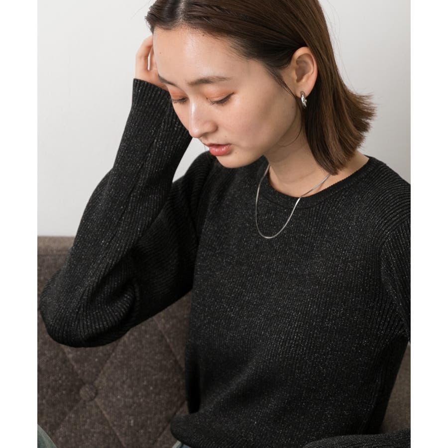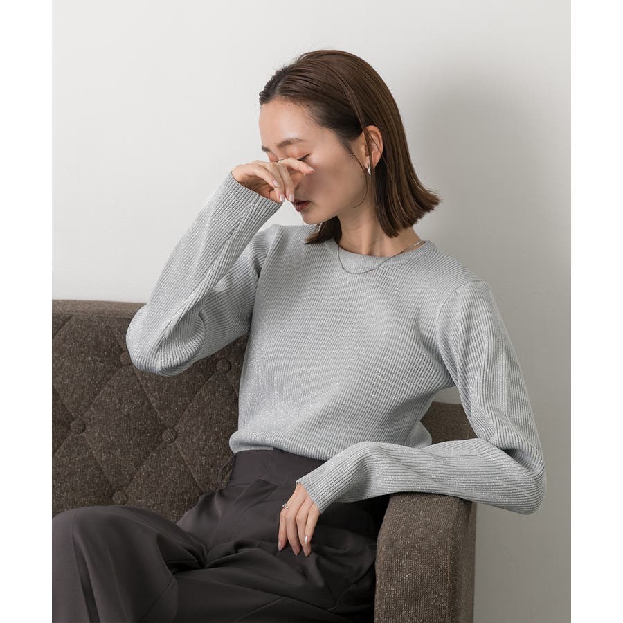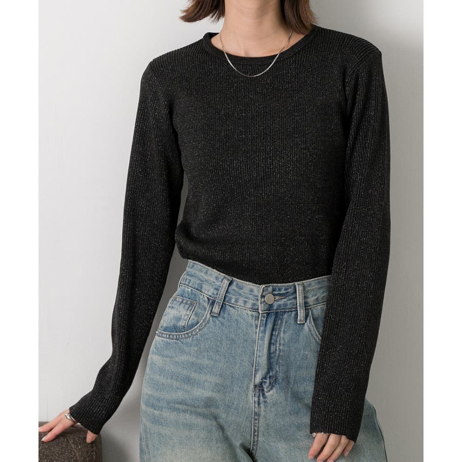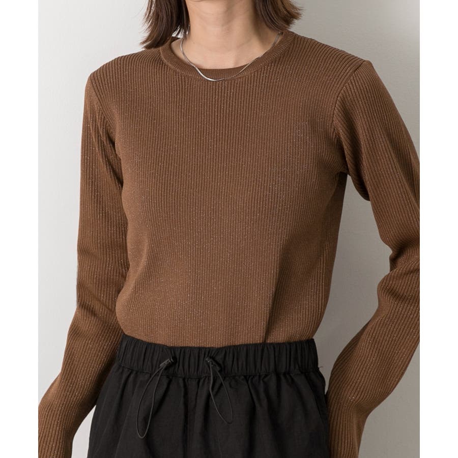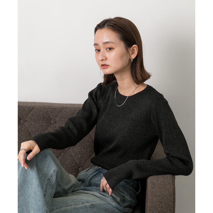 さりげなく輝くラメがポイントになる、シンプルなクルーネックニットトップス