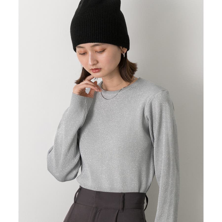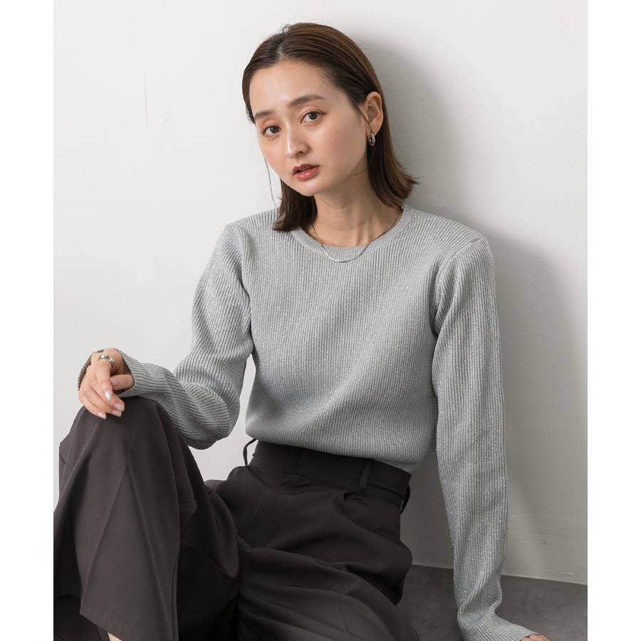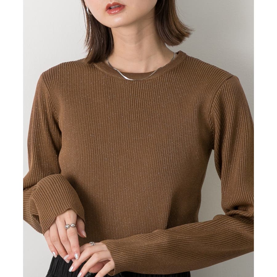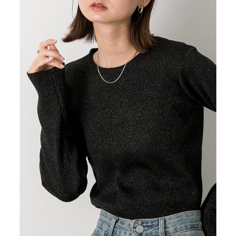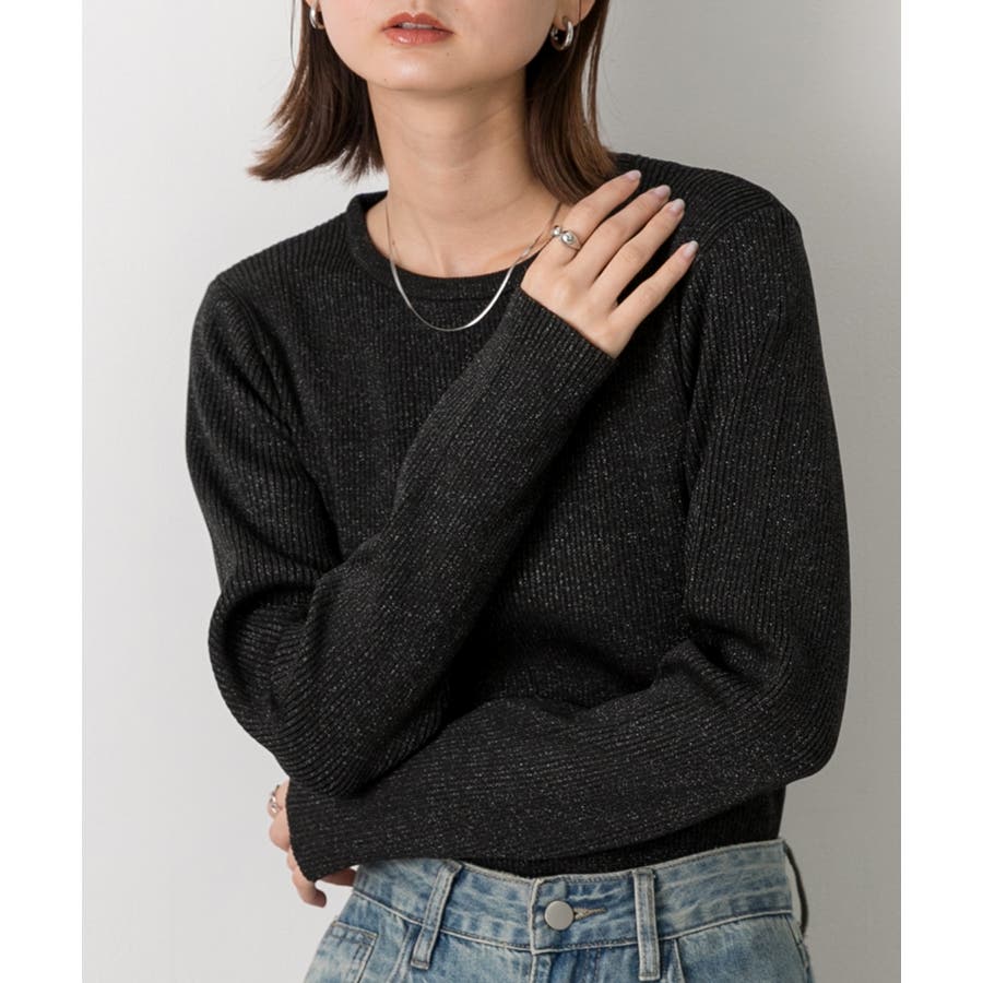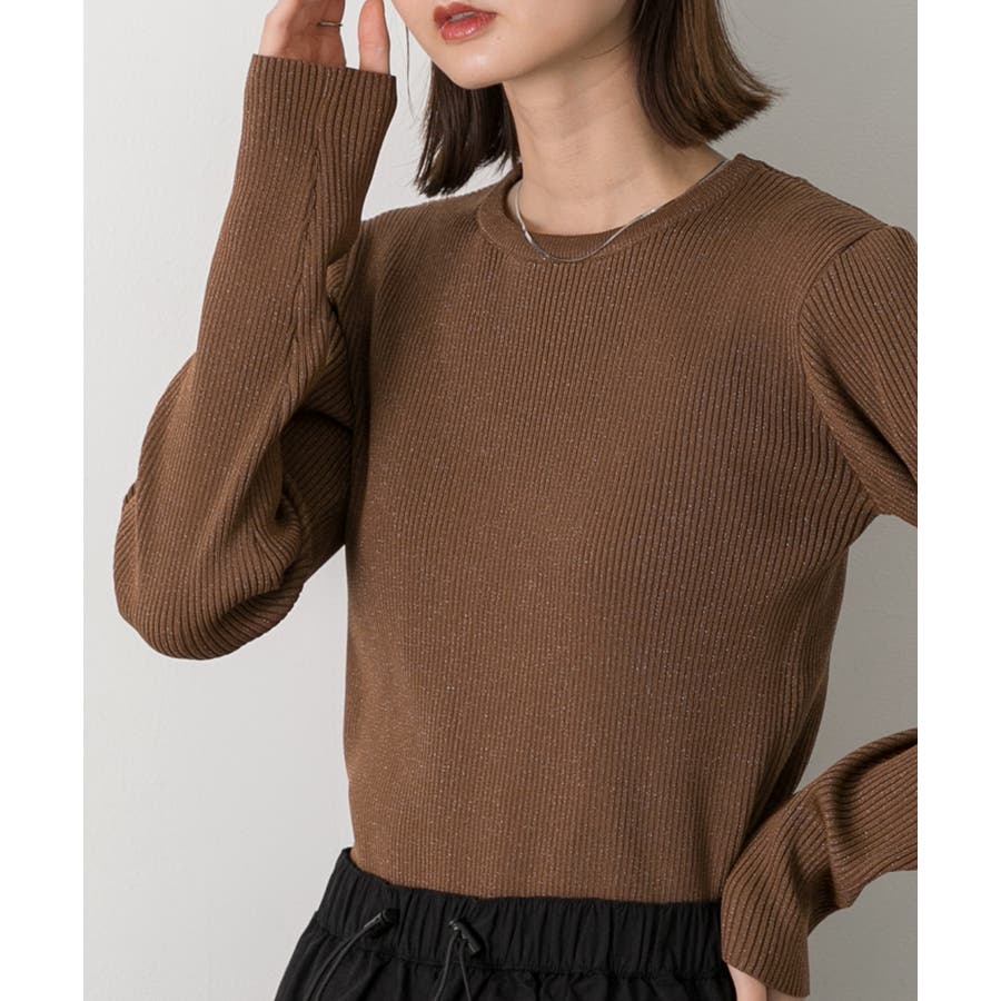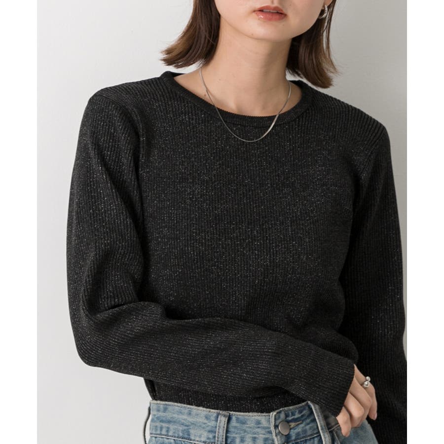 さりげなく輝くラメがポイントになる、シンプルなクルーネックニットトップス