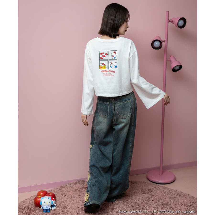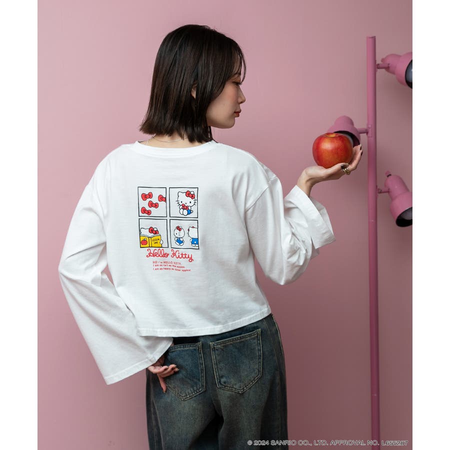 HELLO KITTYのトレードマークでもあるリボンでお顔を隠したプリントがさりげなく、遊び心のあるバックプリントが心くすぐるコラボTシャツです。