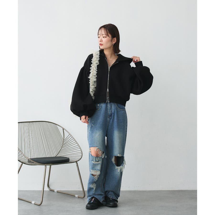 ラフになりがちなジップパーカーだけど、インパクトあるボリュームスリーブや