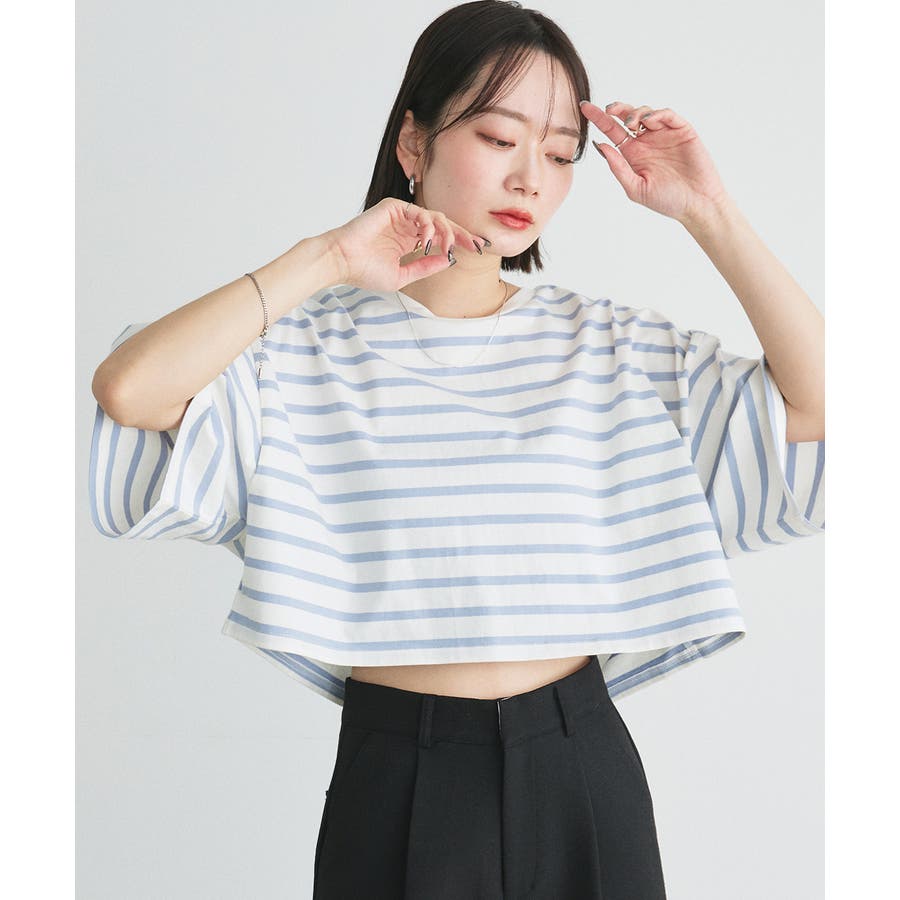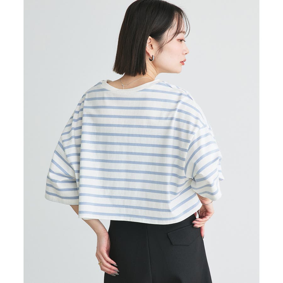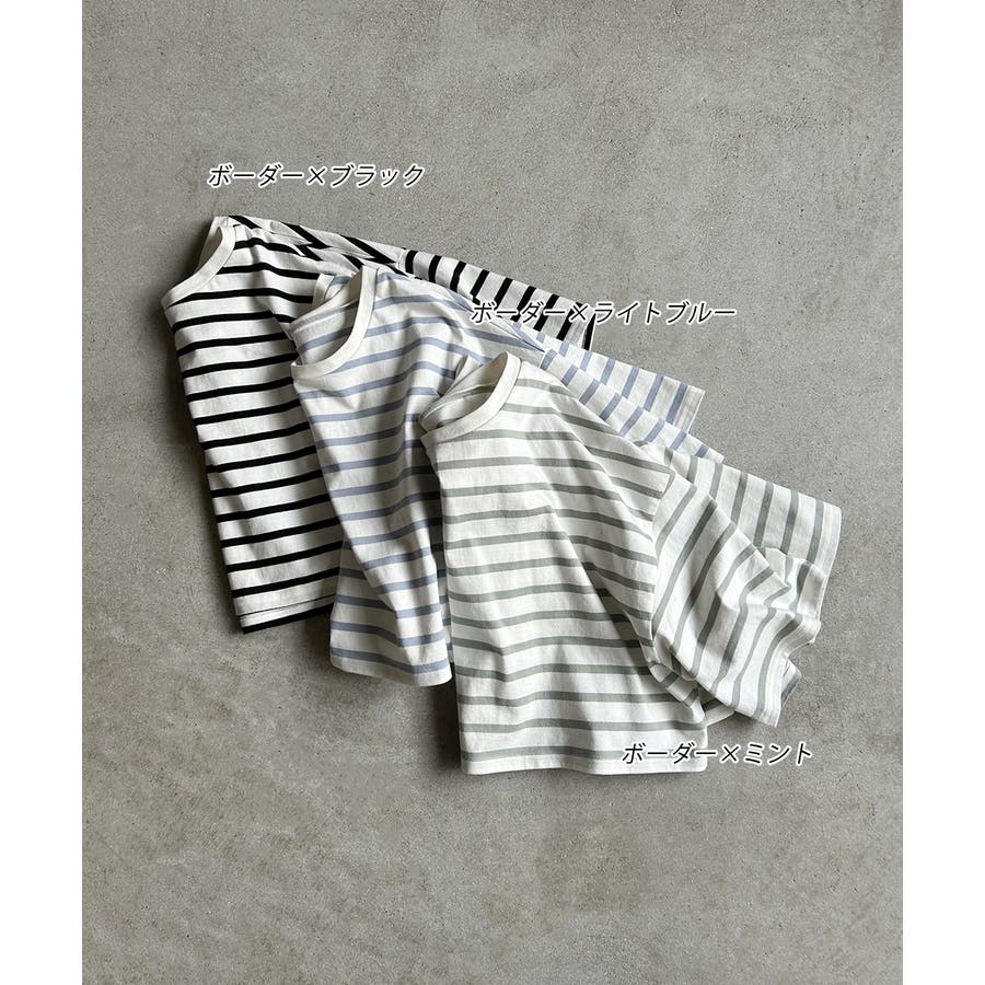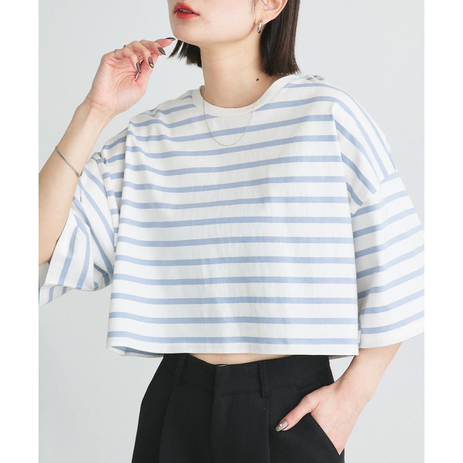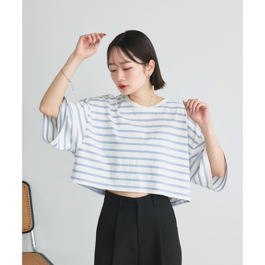 【ボーダー×ライトブルー】ベーシックショート丈Tシャツ