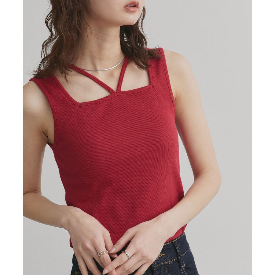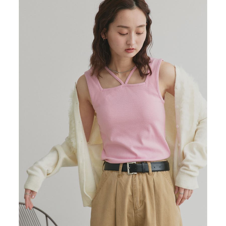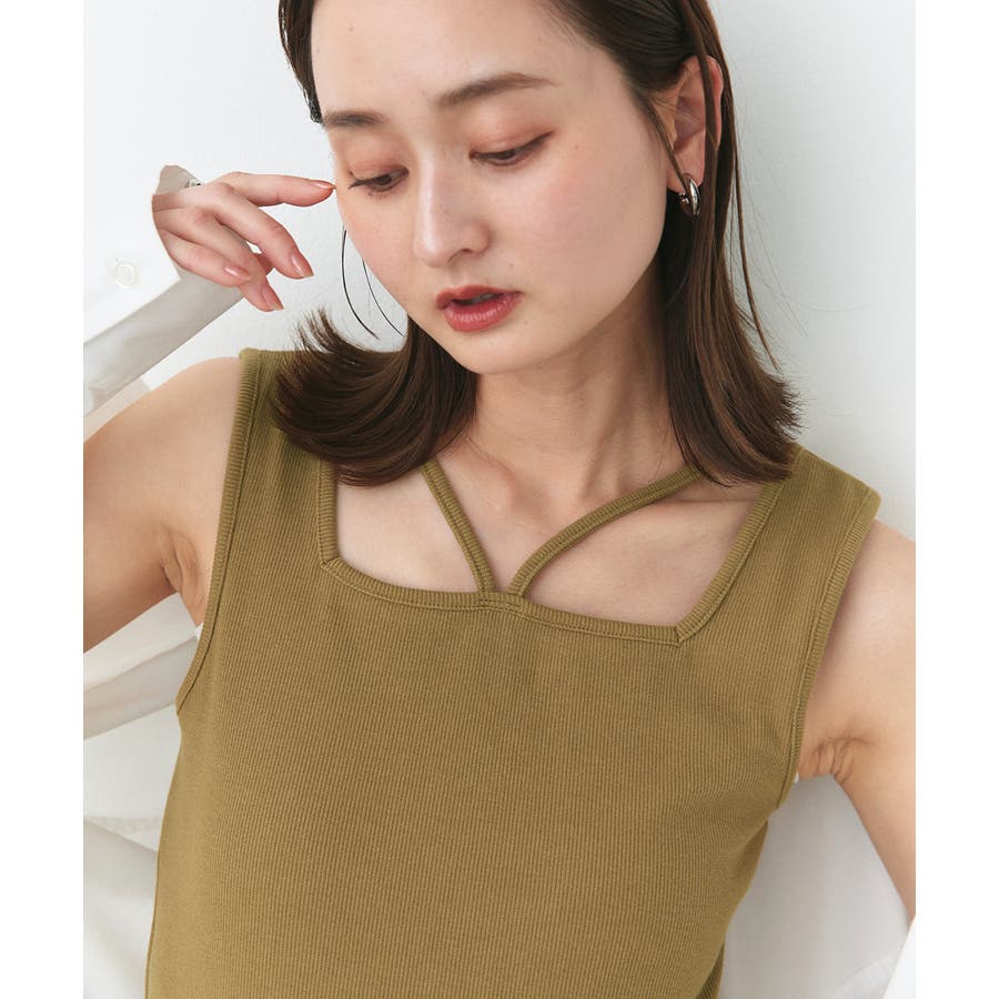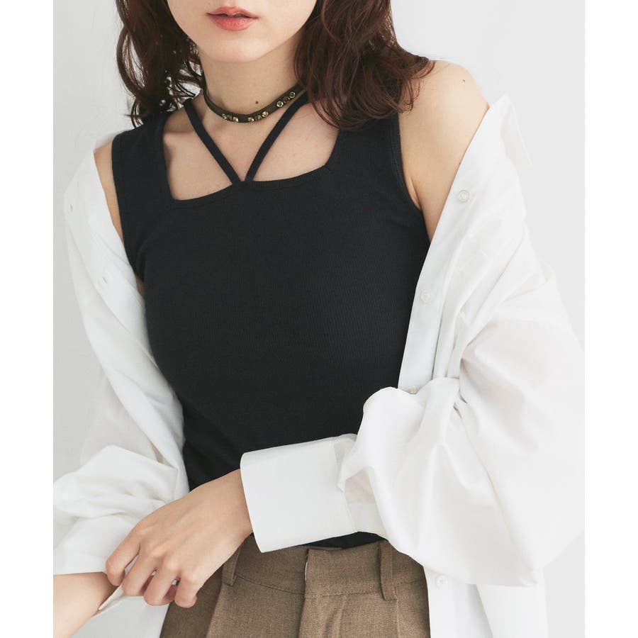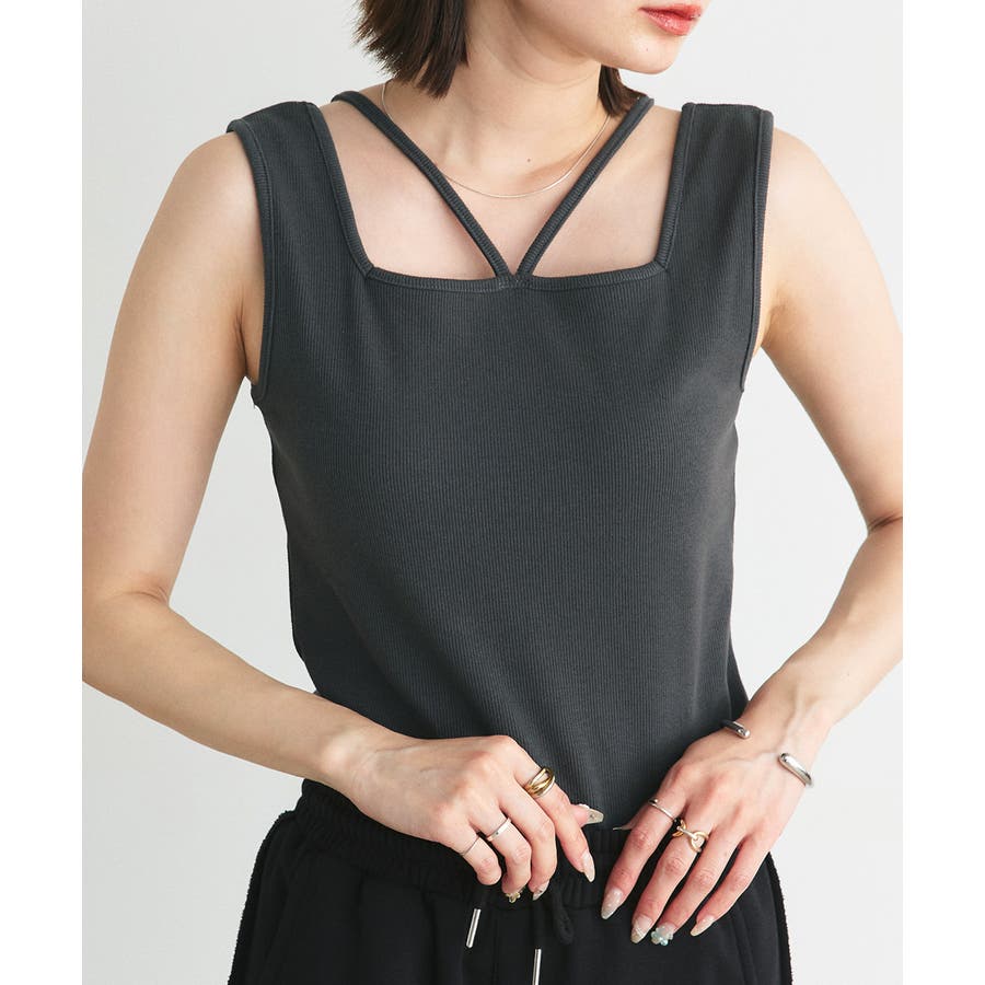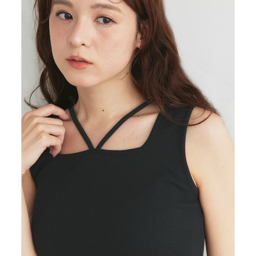 2wayネックスクエアホルターリブタンクトップ