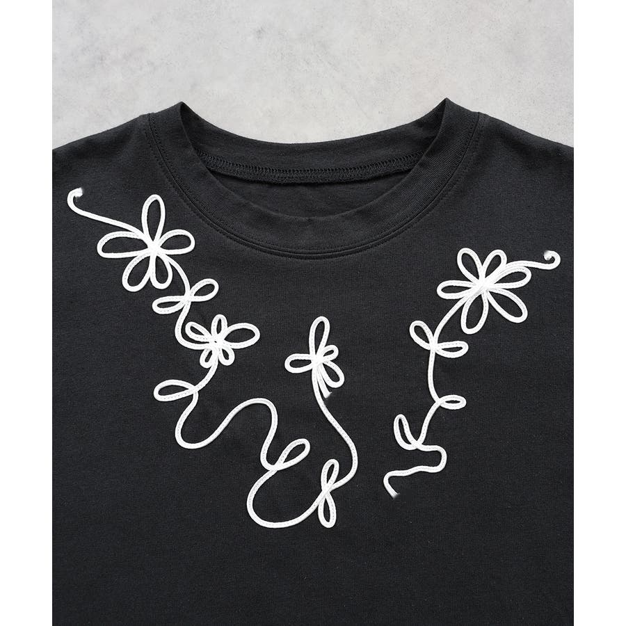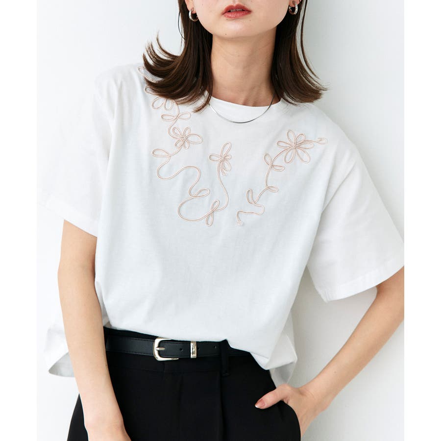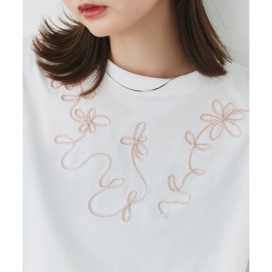 フラワーモチーフコード刺繍Tシャツ