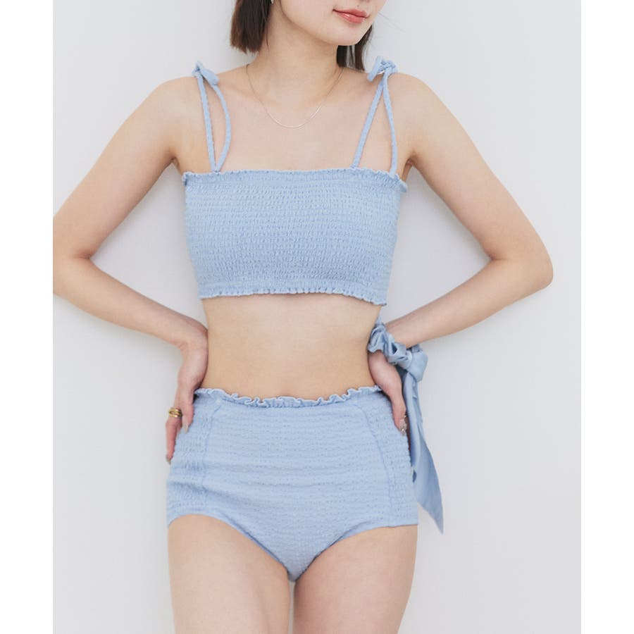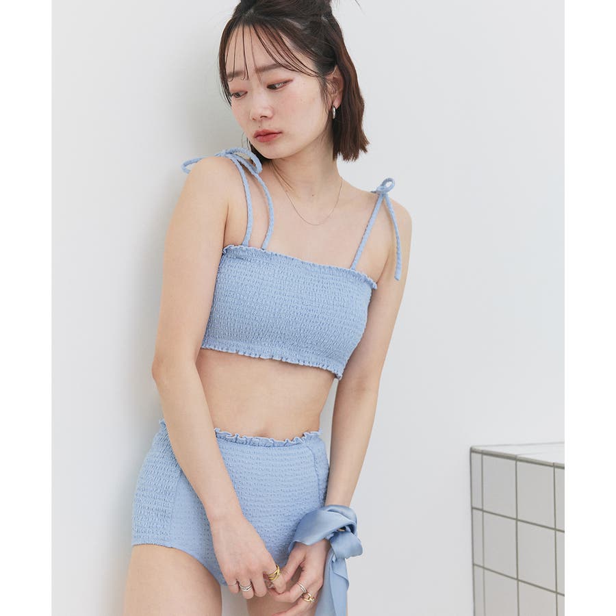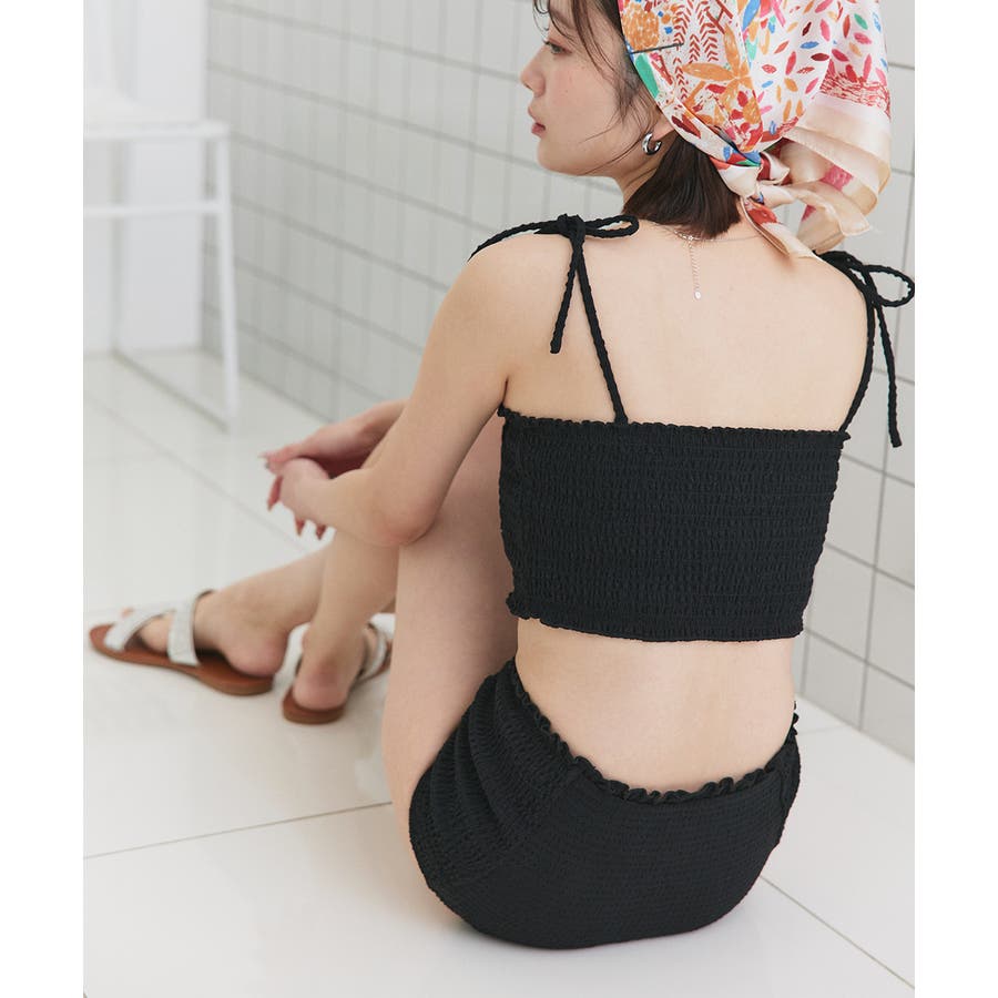 華奢なリボンストラップとシャーリングデザインがトレンド感あるスイムウェア2点セット。