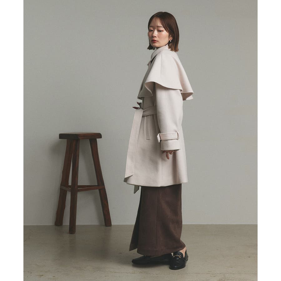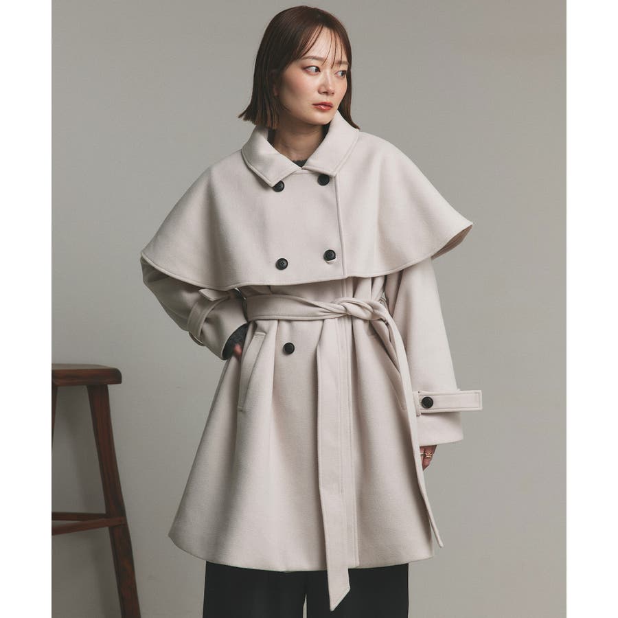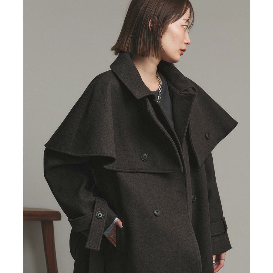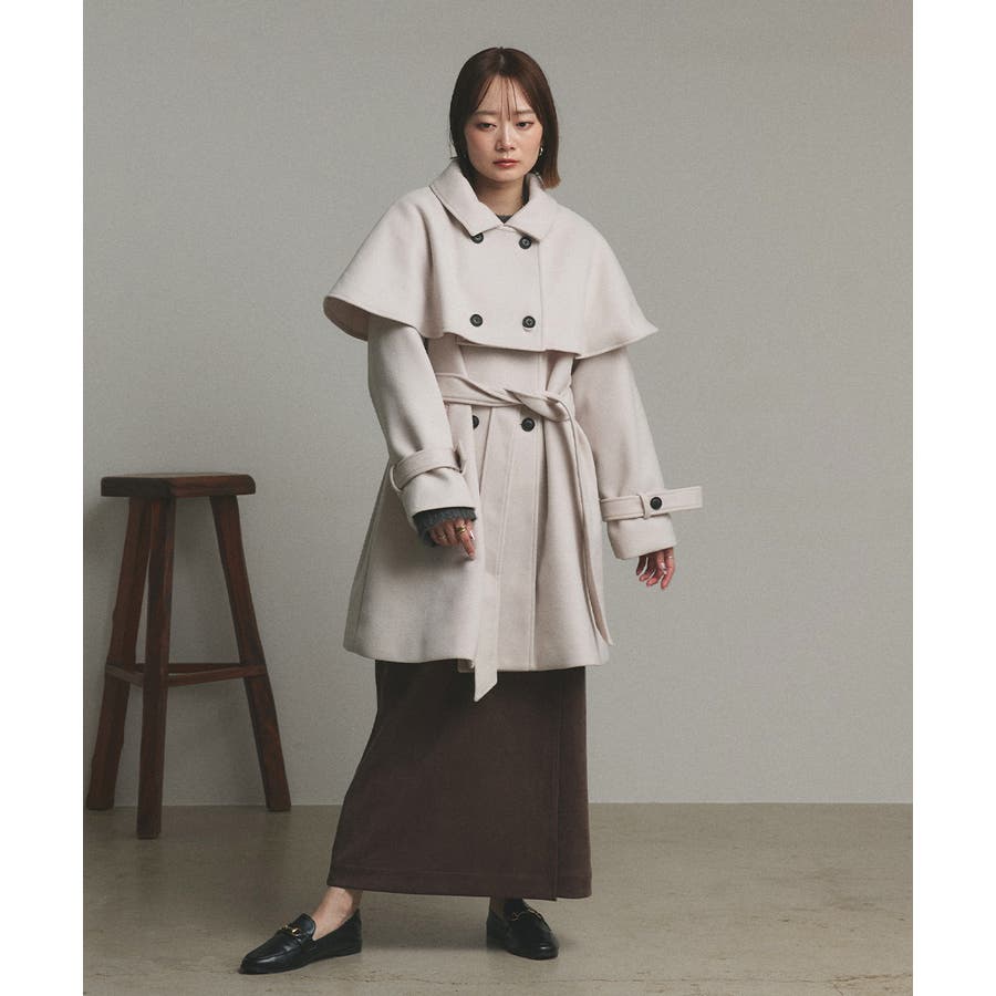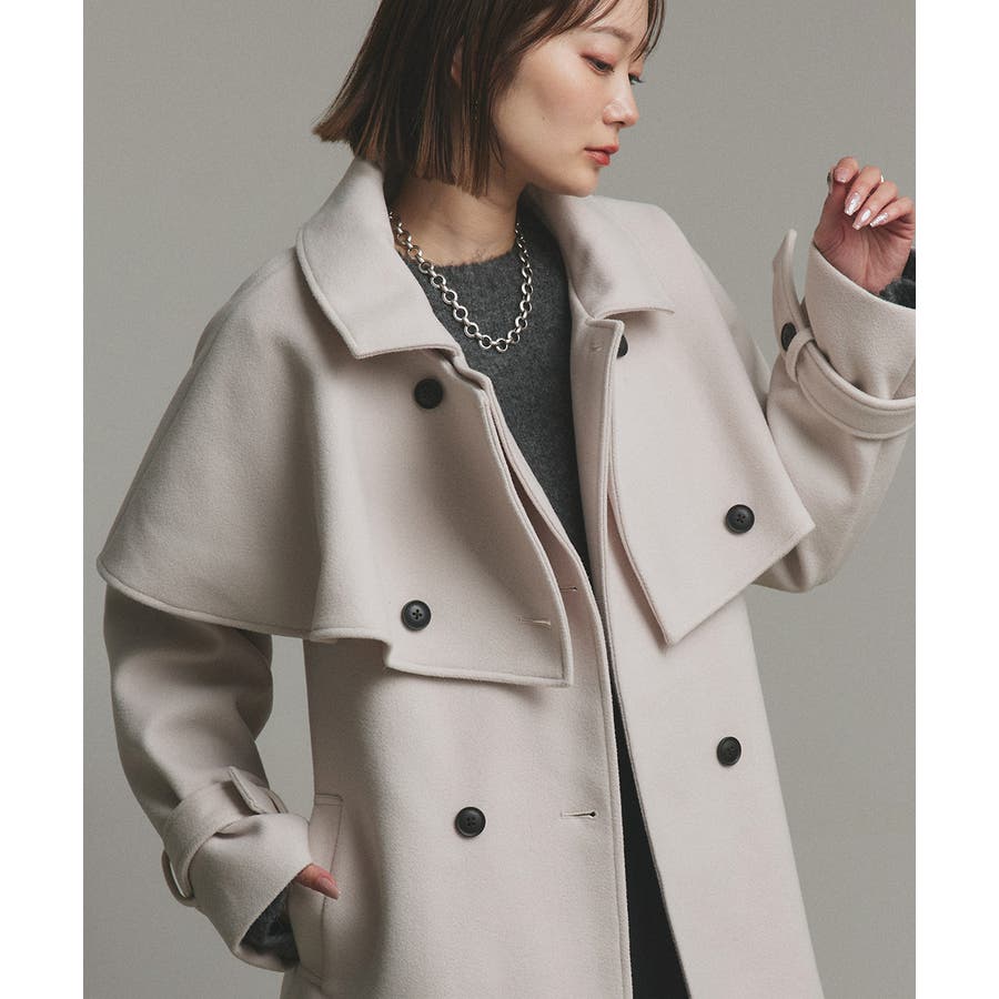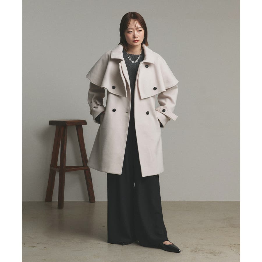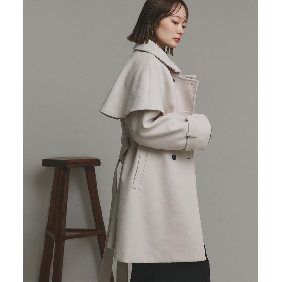 ケープを外せばシンプルなダブルコートに変身し、スッキリとした印象で着こなせます。