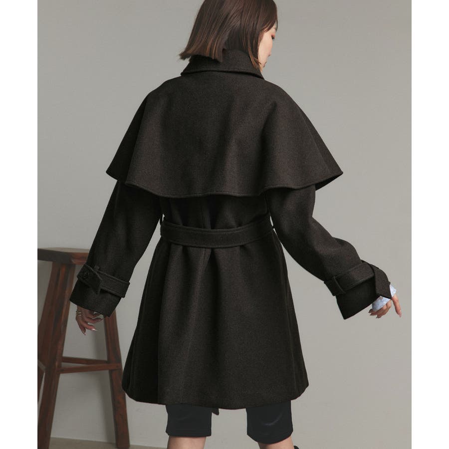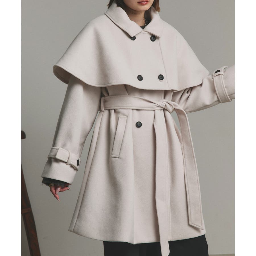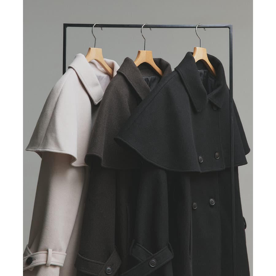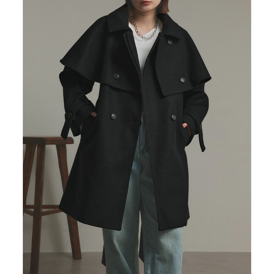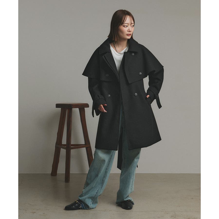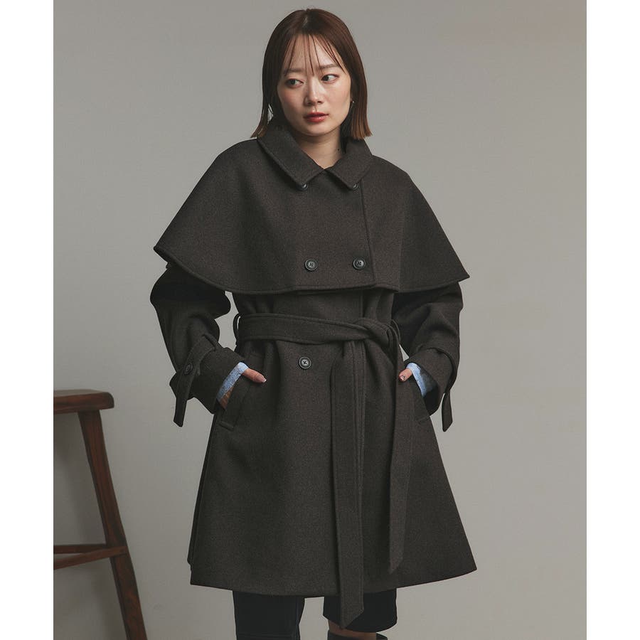 ケープを外せばシンプルなダブルコートに変身し、スッキリとした印象で着こなせます。
