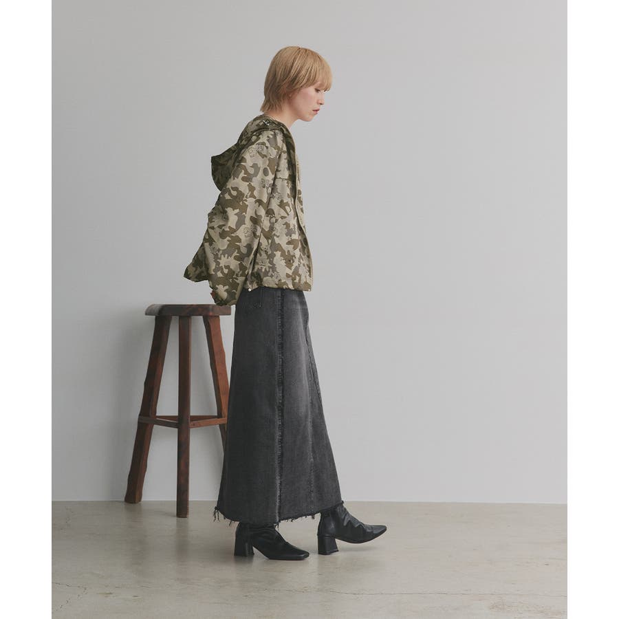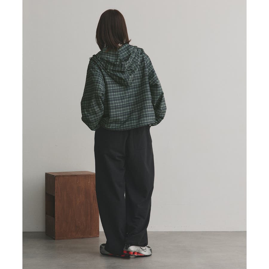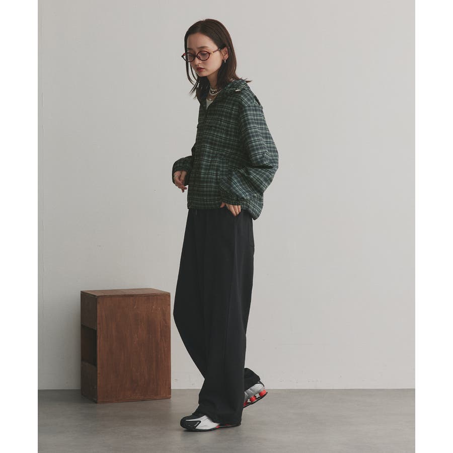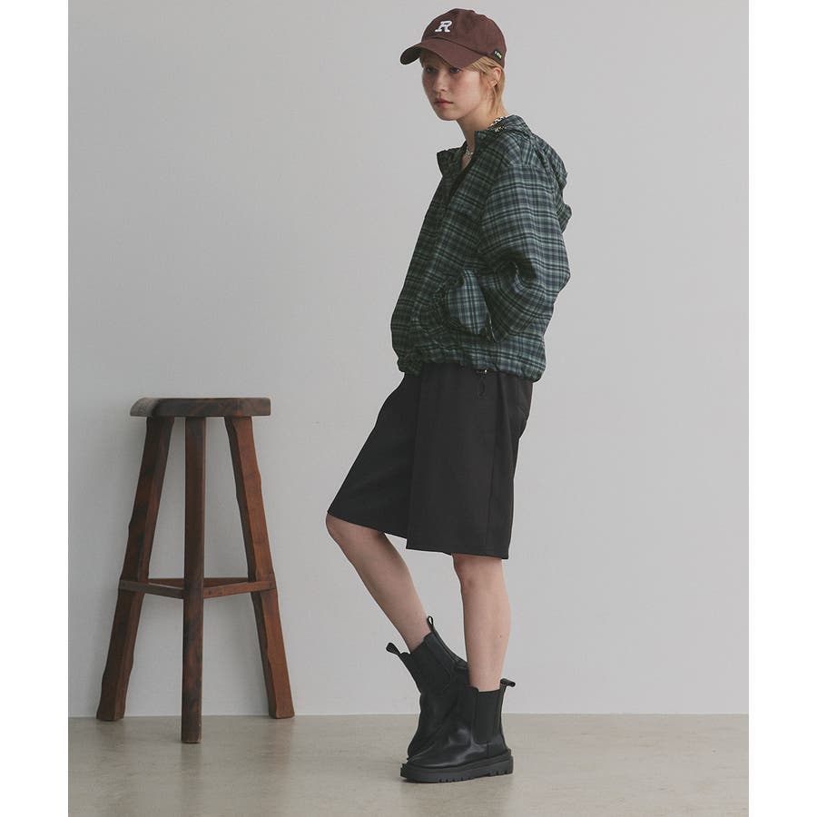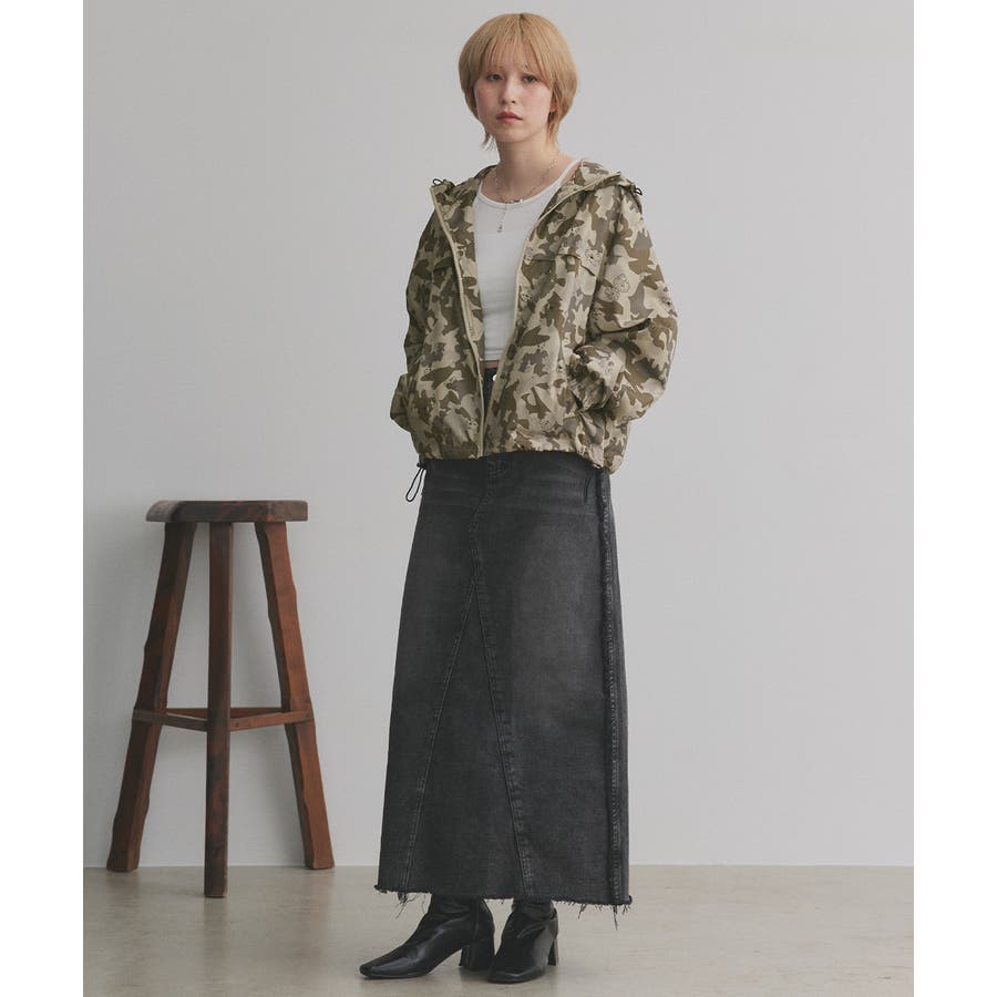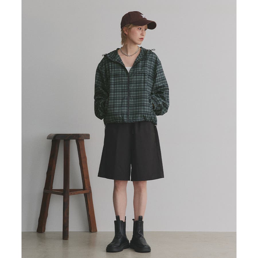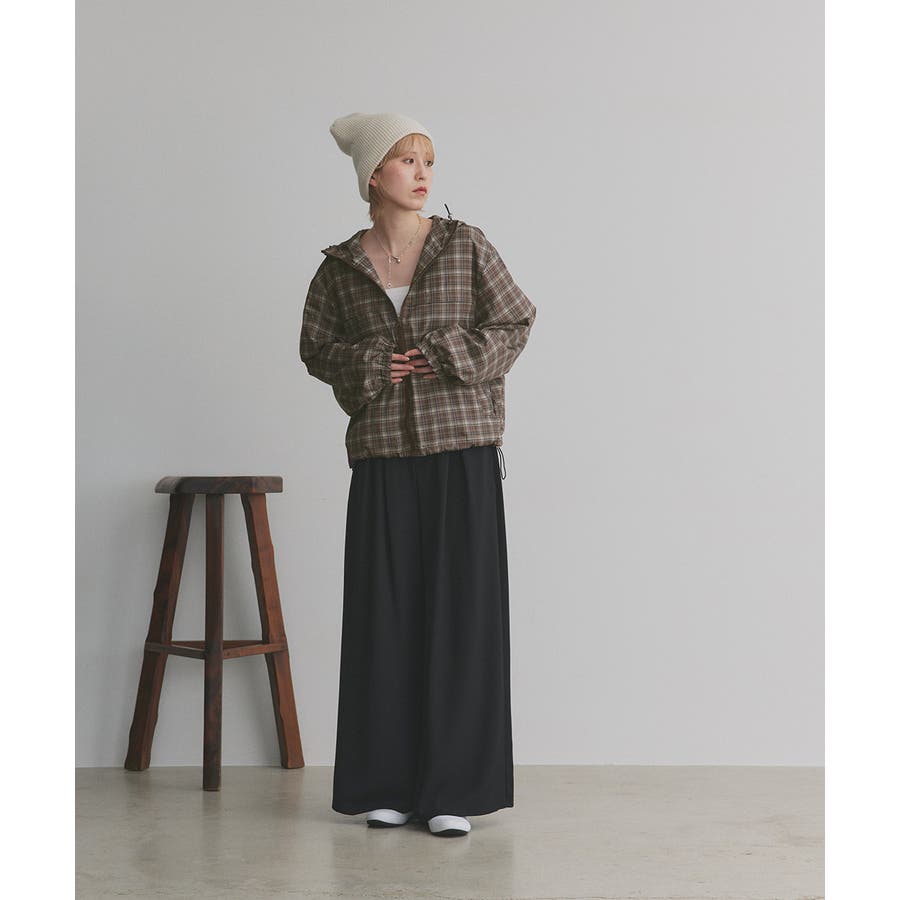 裾のドローコードを絞ってショート丈にシルエットチェンジするとトレンド感ある着こなしに。