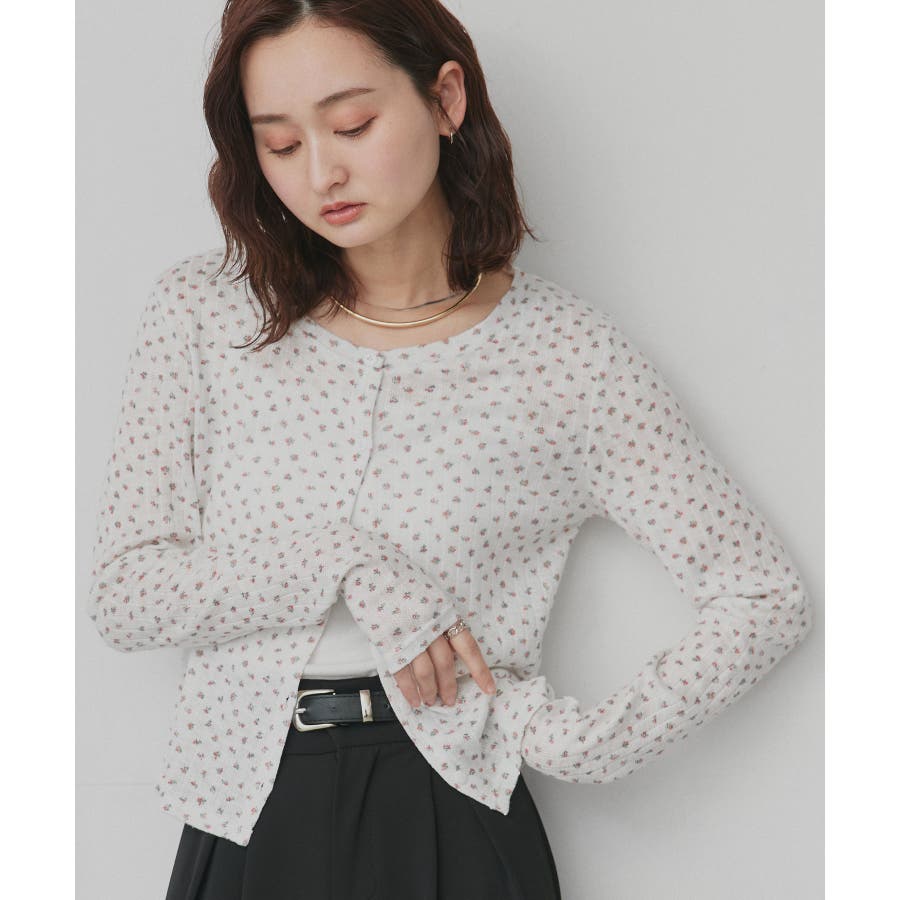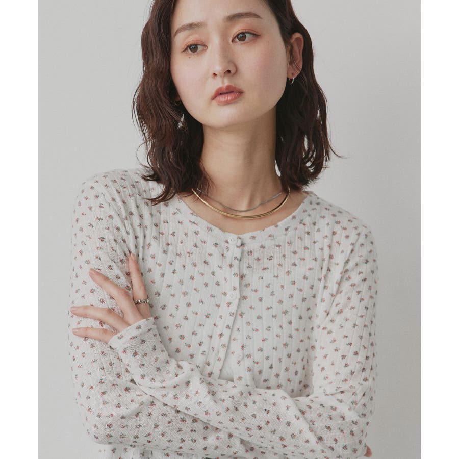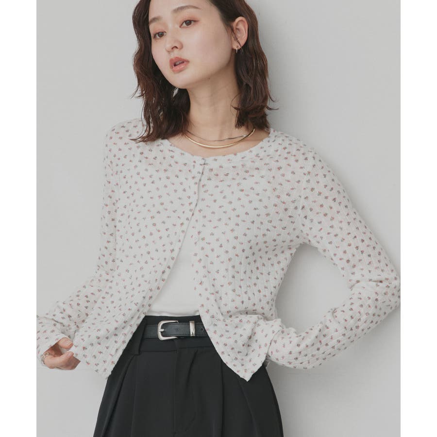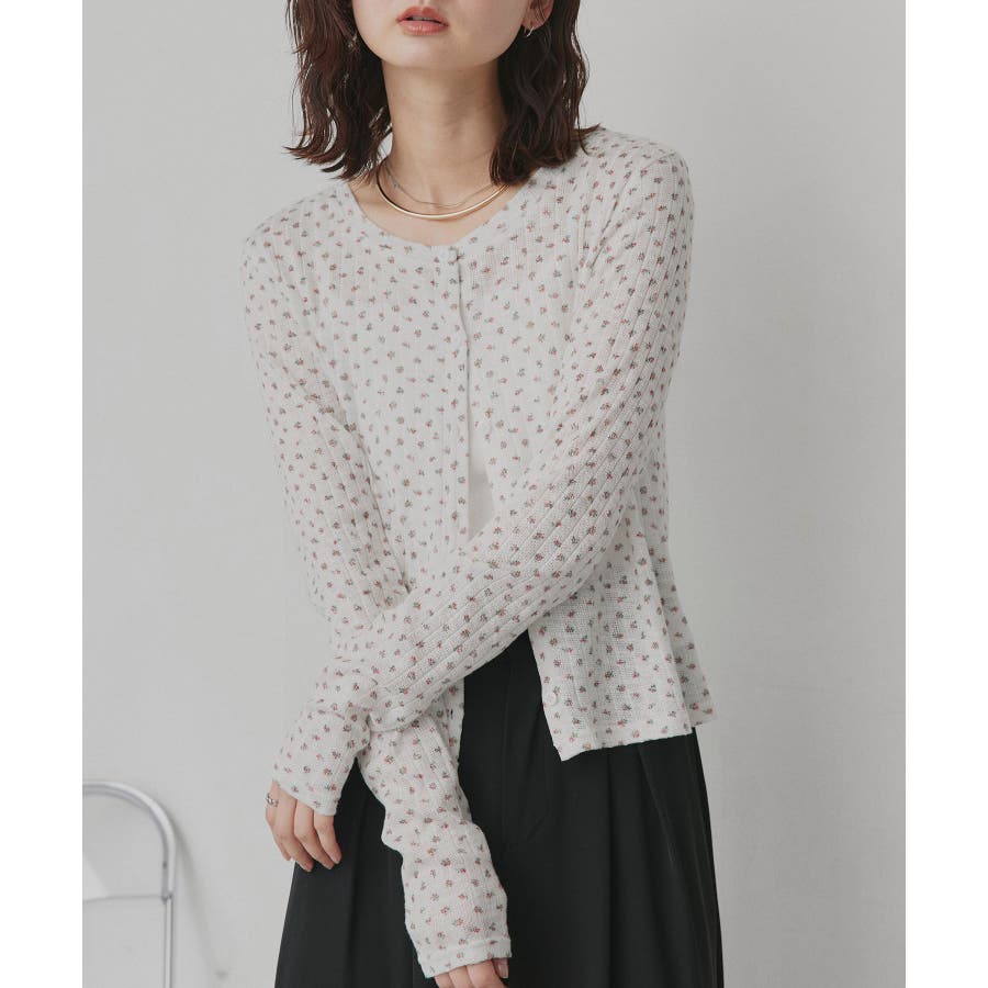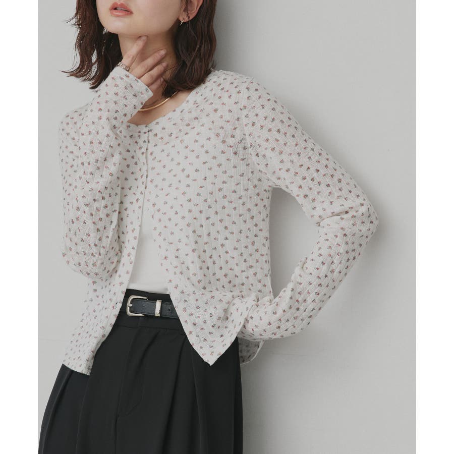 カーディガンは、春夏らしい小花柄の透かし編みデザインがポイント。