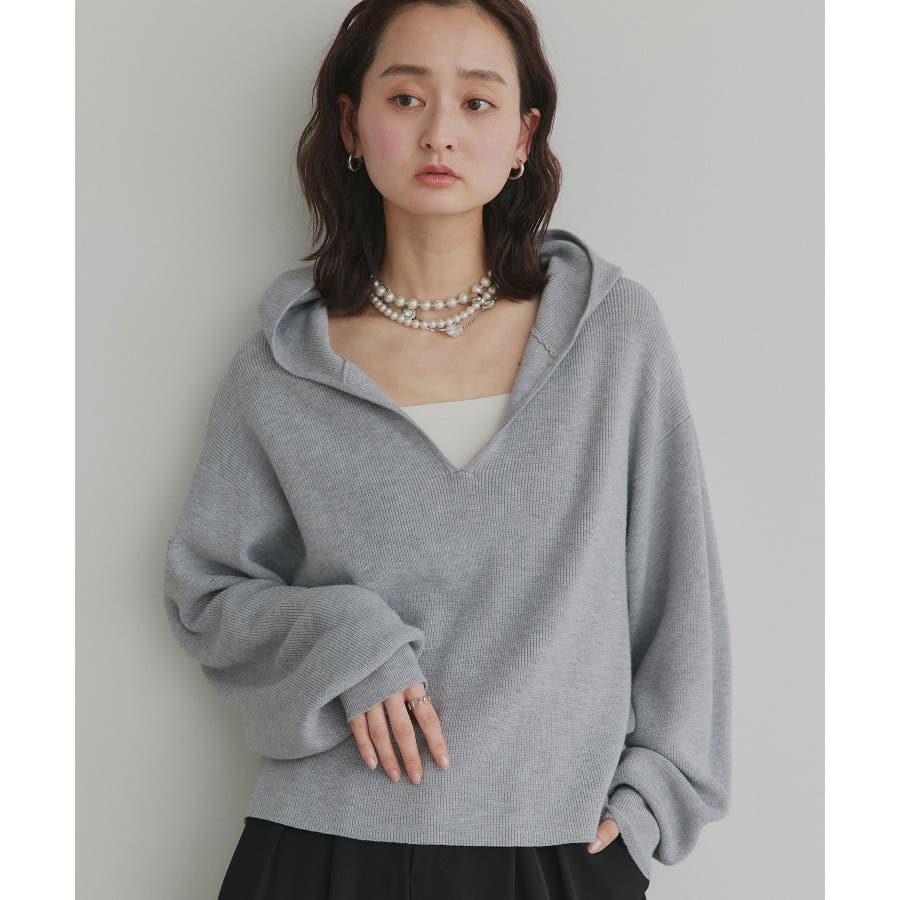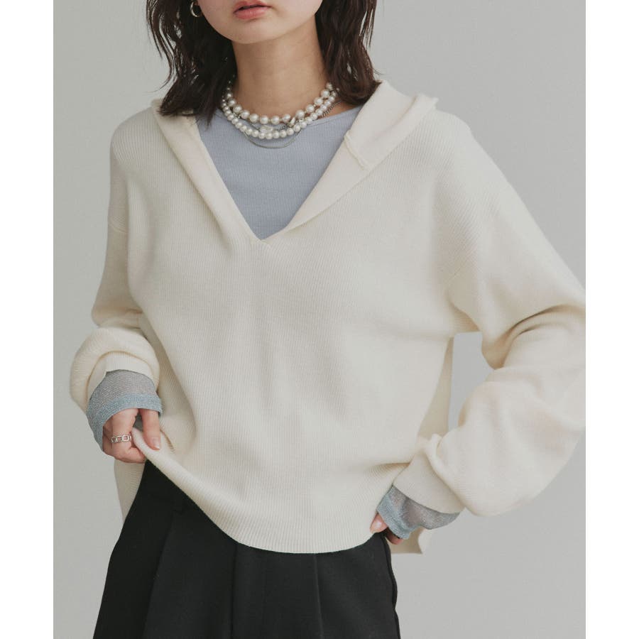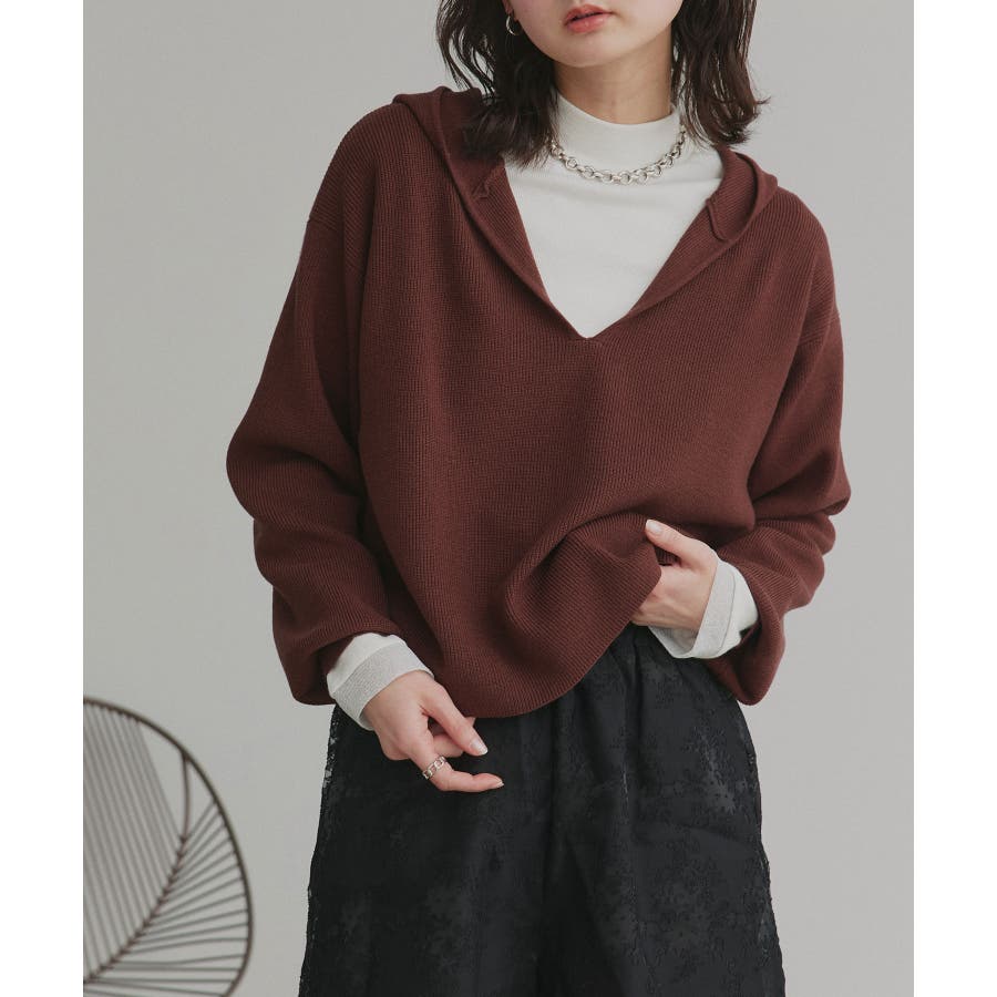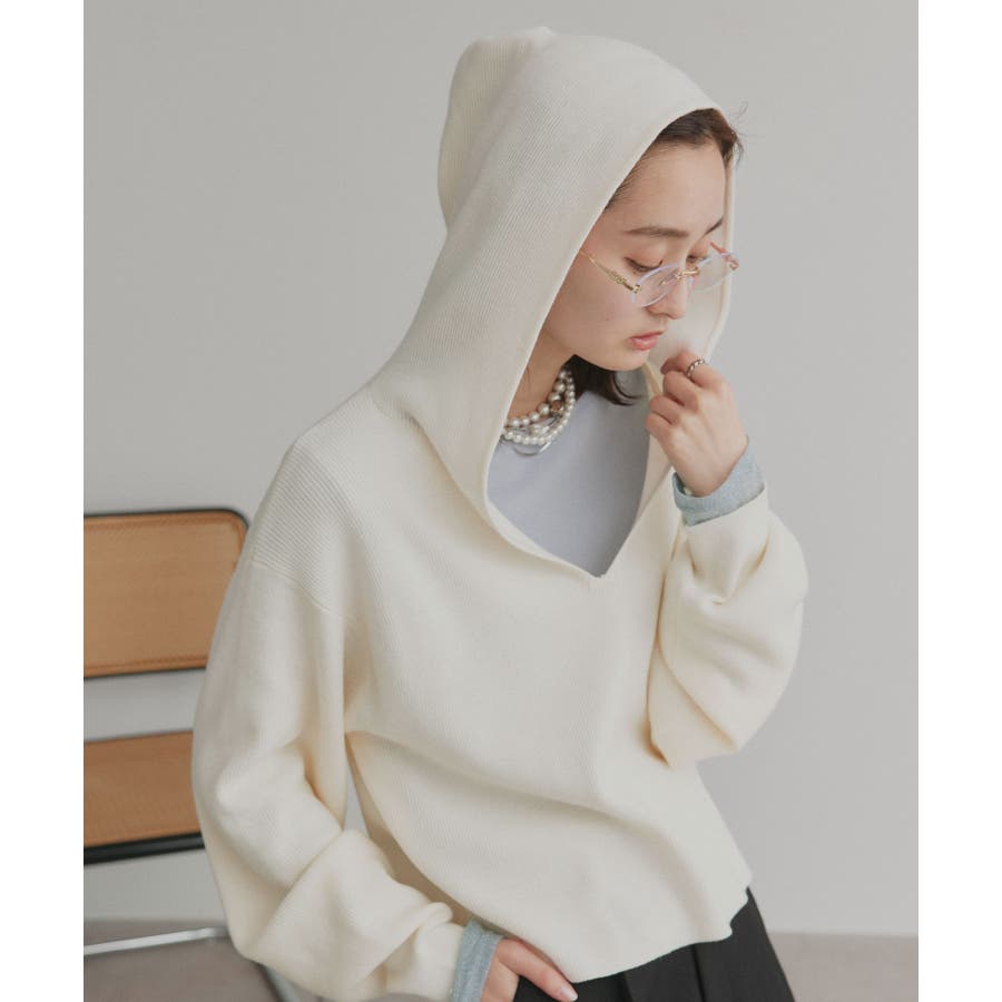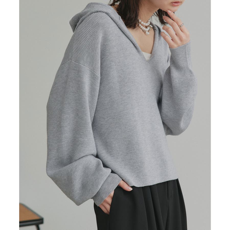 深めに開いたVネックニットにフードが付いた大人カジュアルに仕上がるアイテム。