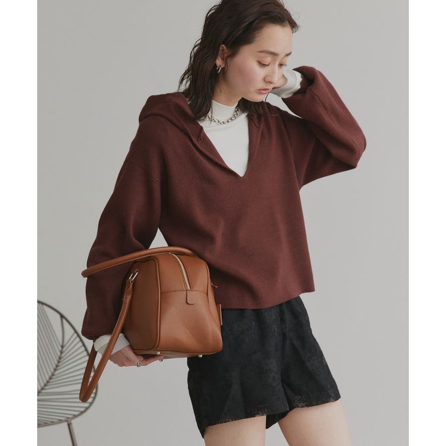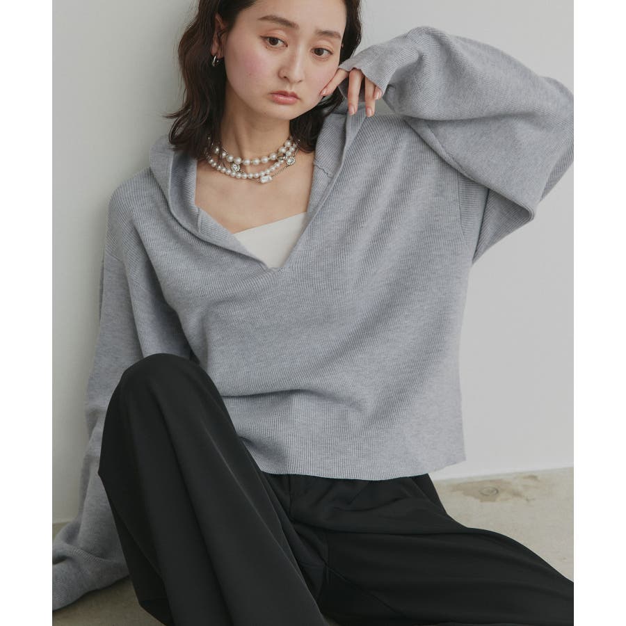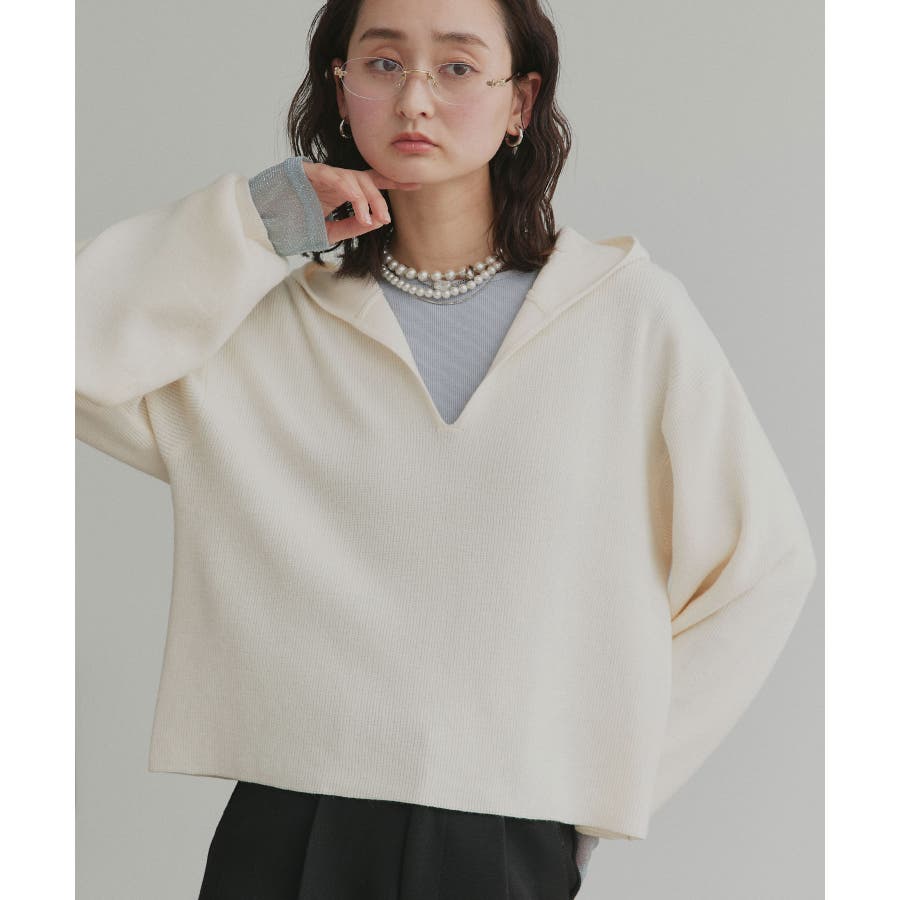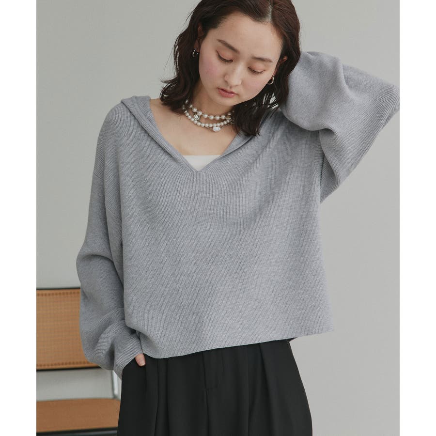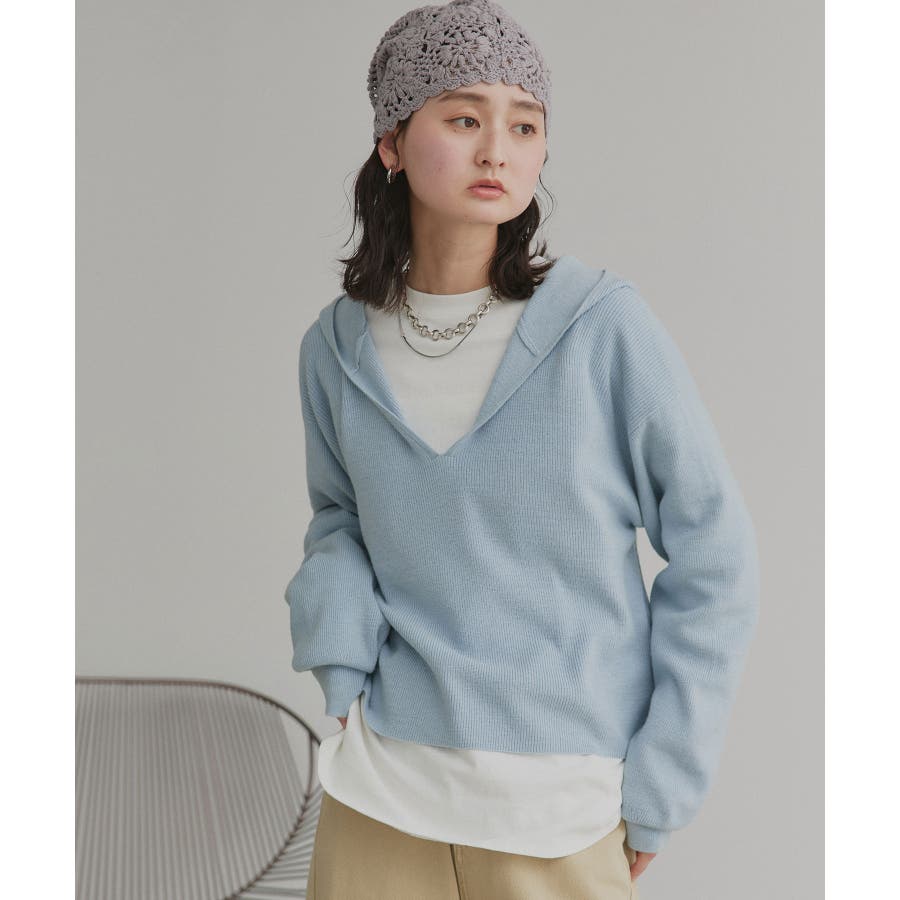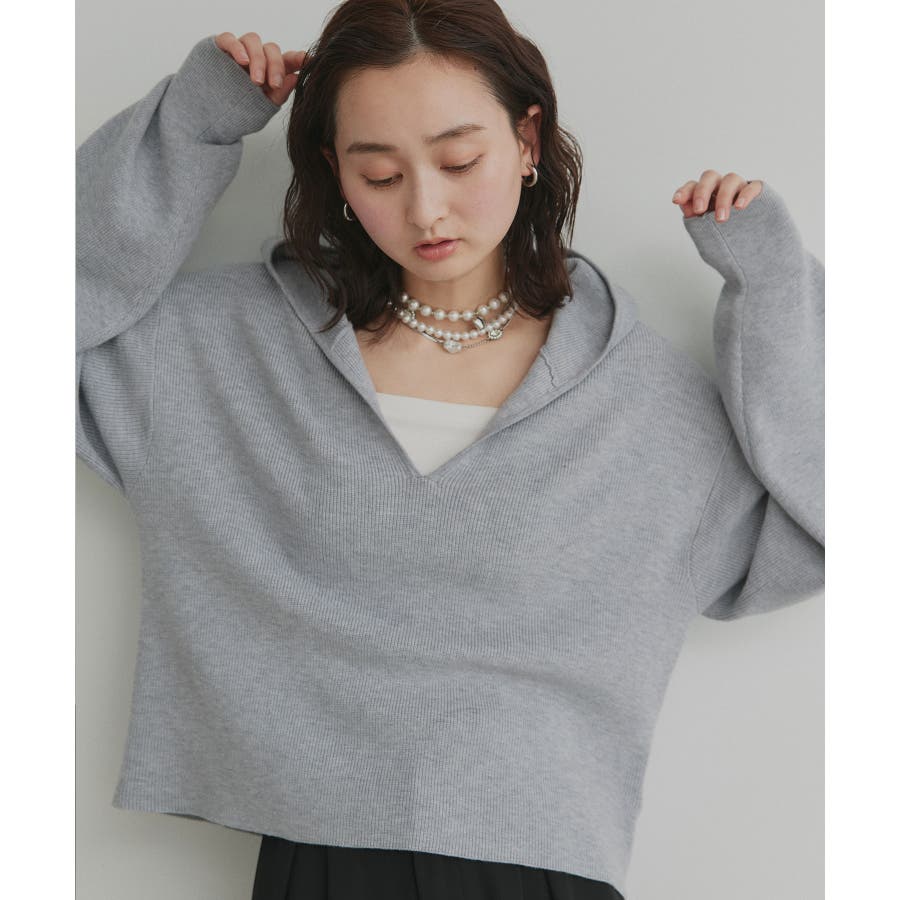 深めに開いたVネックニットにフードが付いた大人カジュアルに仕上がるアイテム。