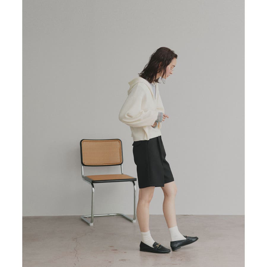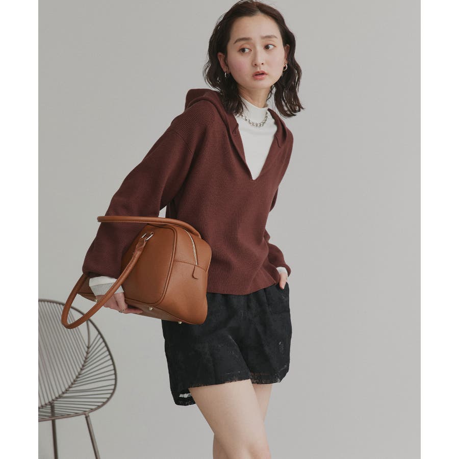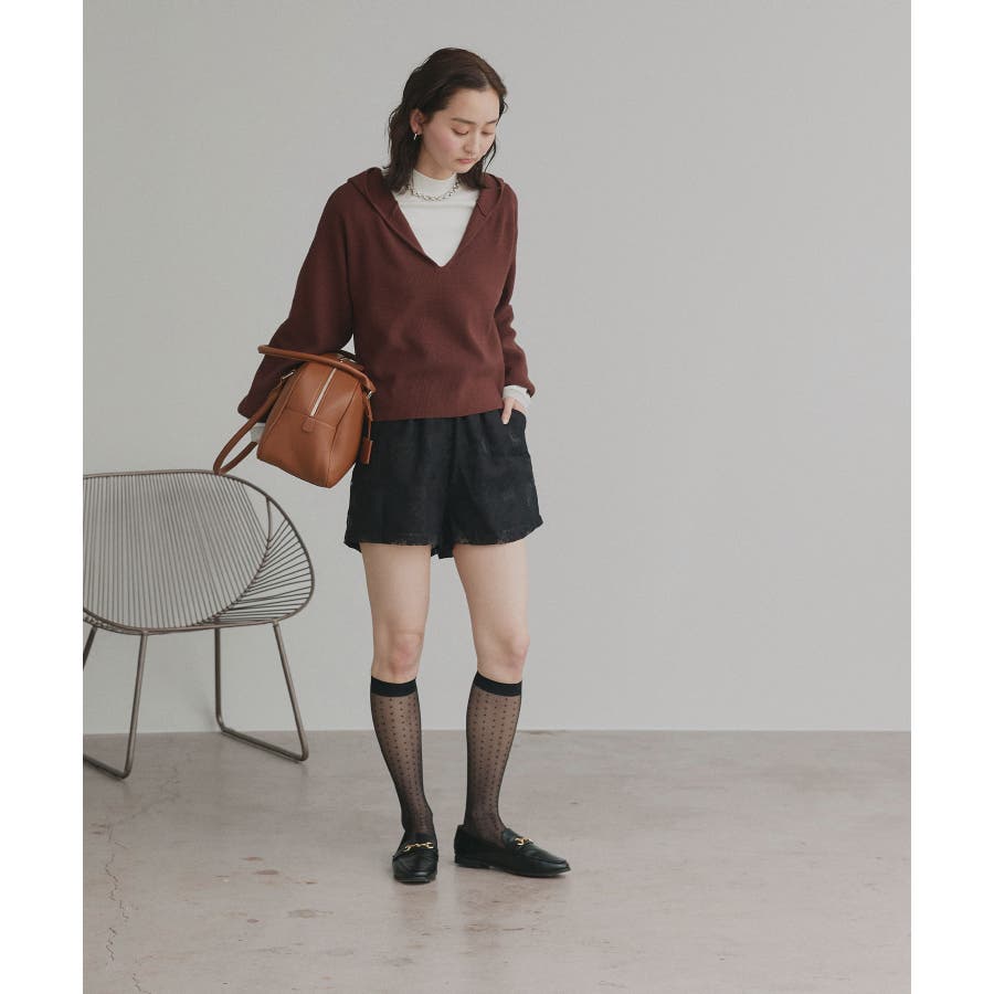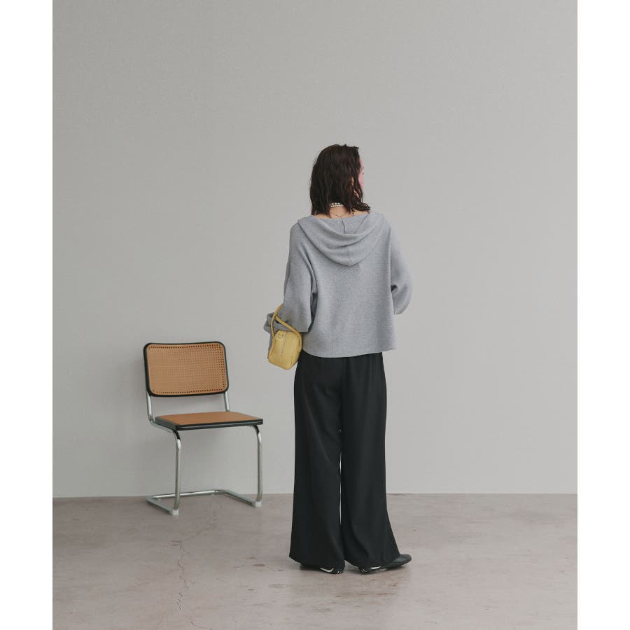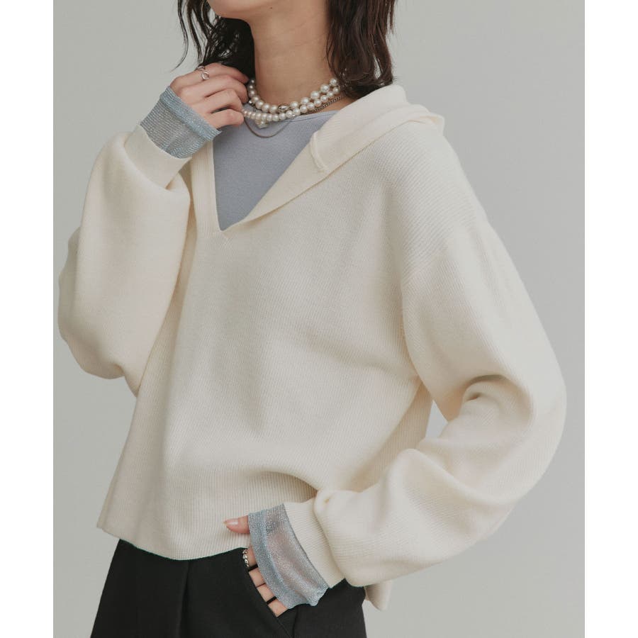 深めに開いたVネックニットにフードが付いた大人カジュアルに仕上がるアイテム。