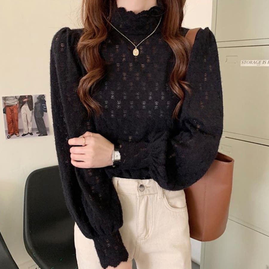 Y2K オフィス レース ハイネック 袖ボリューム カフス ふんわり 冬春 レイヤードトップス レーヤード パフスリーブ 起毛 フェミニン きちんと 大人 シンプル 韓国 韓国ファッション 人気レーストップス 人気アイテム タートルネック ブラウス 長袖 フォーマル