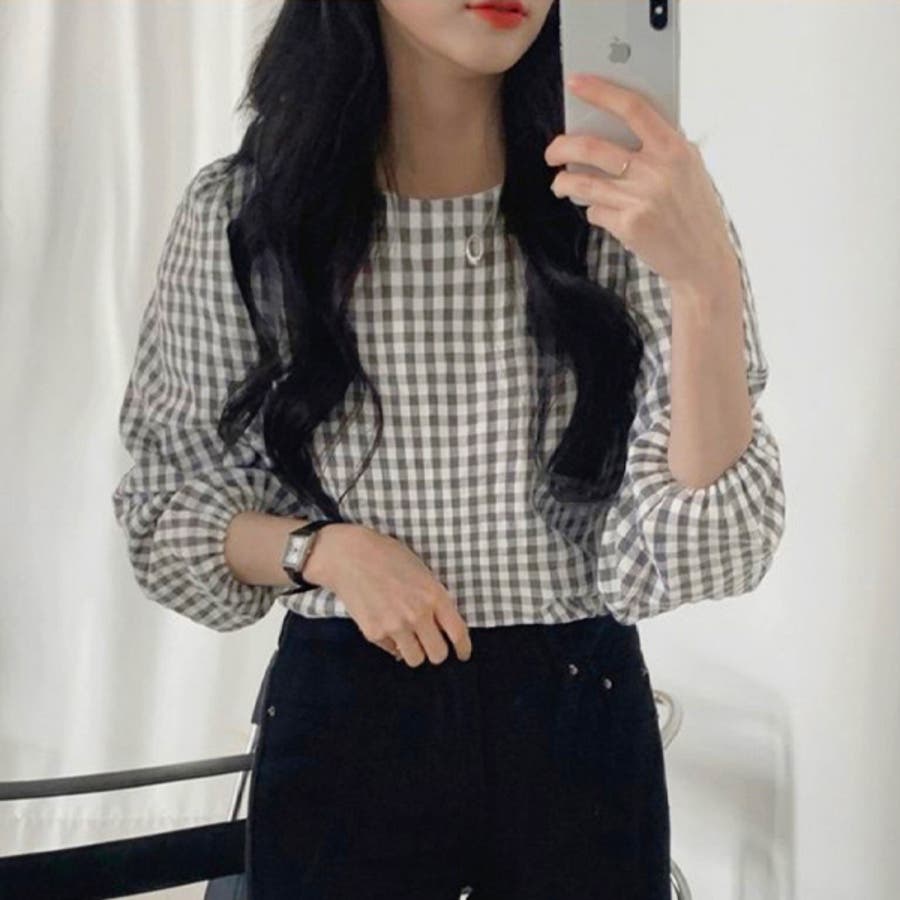 春 春コーデ 春ファッション 春服 夏 夏コーデ 夏ファッション 夏服 カジュアル カジュアルコーデ 大人 大人カジュアル オフィスカジュアル オフィス オフィスファッション オフィススタイル 韓国 韓国ファッション 韓国コーデ プチプラ プチプラファッション Y2K チェック チェックブラウス ギンガム ギンガムチェック ブラウス シンプル シンプルブラウス ギンガムブラウス 袖ゴム 涙あき ノーカラー ノーカラーブラウス スッキリ スッキリ見え フェミニン ベージュ グレー