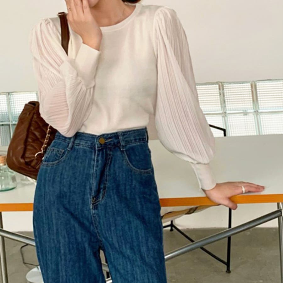 プリーツスリーブニット シフォン 切替