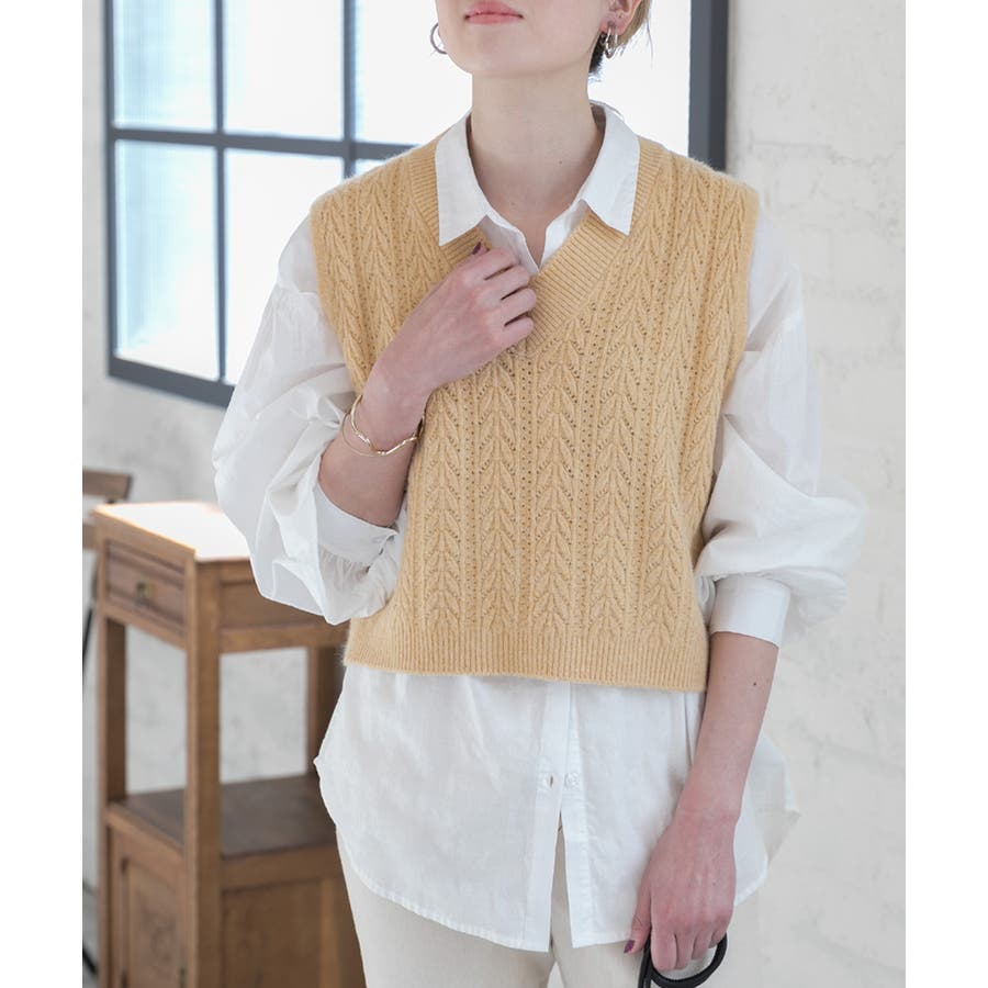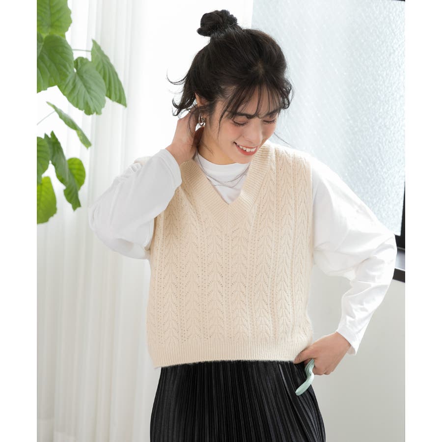 ニットベスト Vネック 前後切替 柄編み ショート丈 ワイド ゆったり