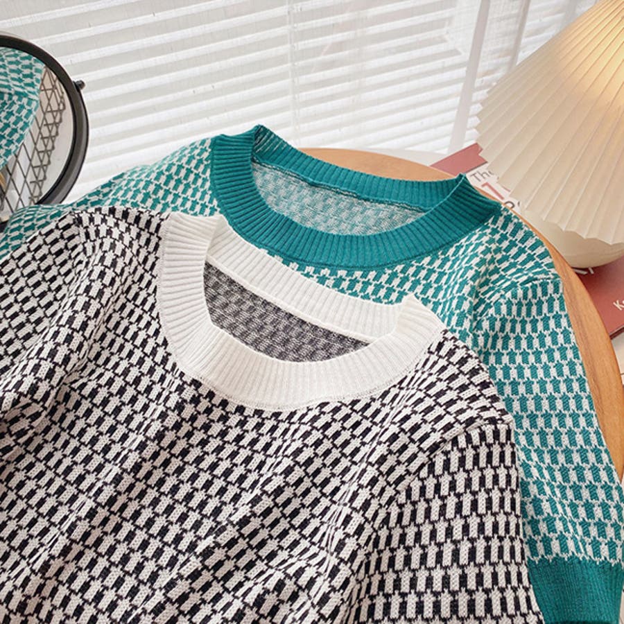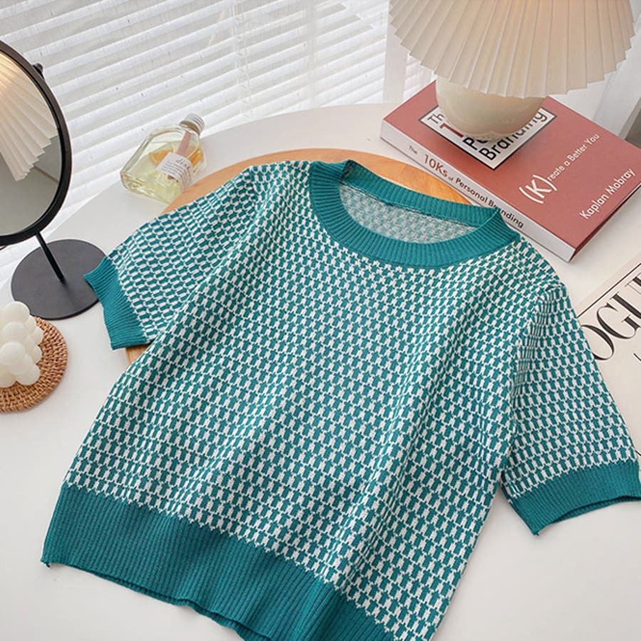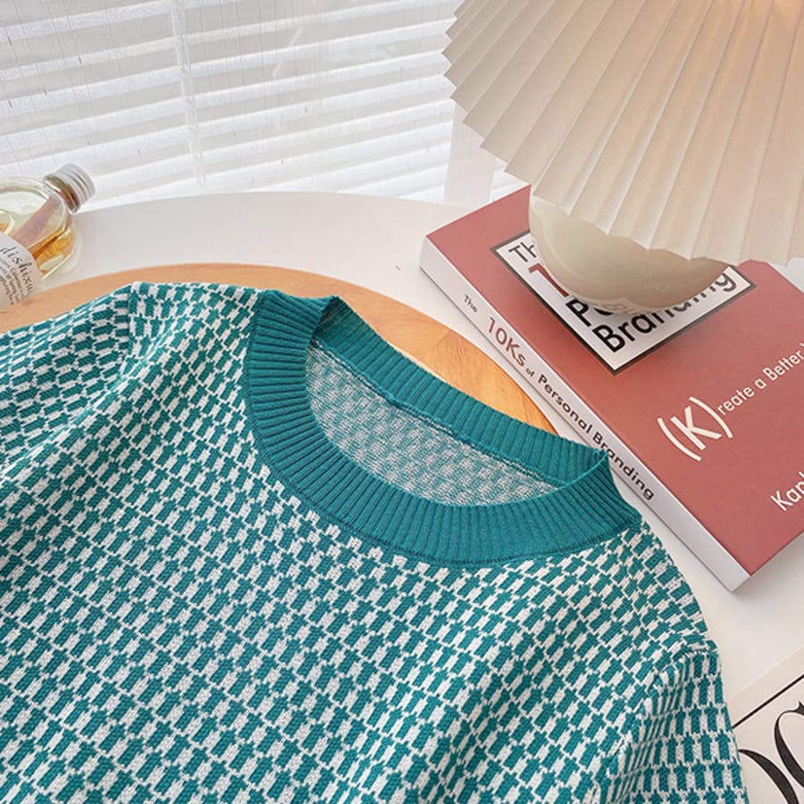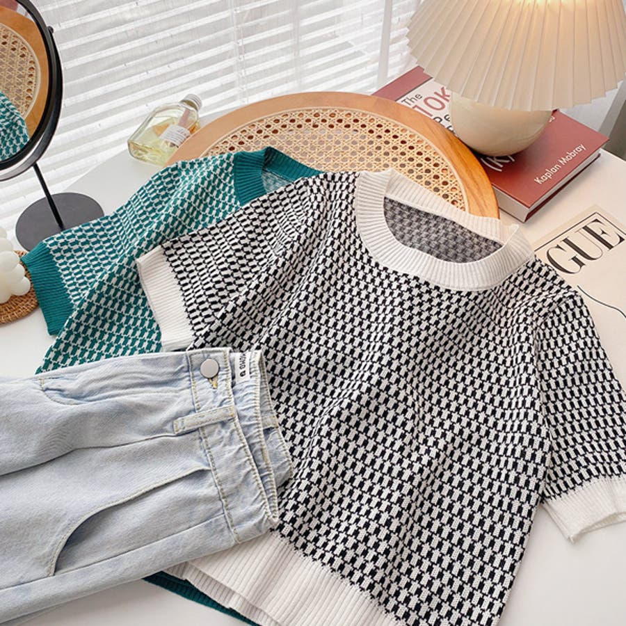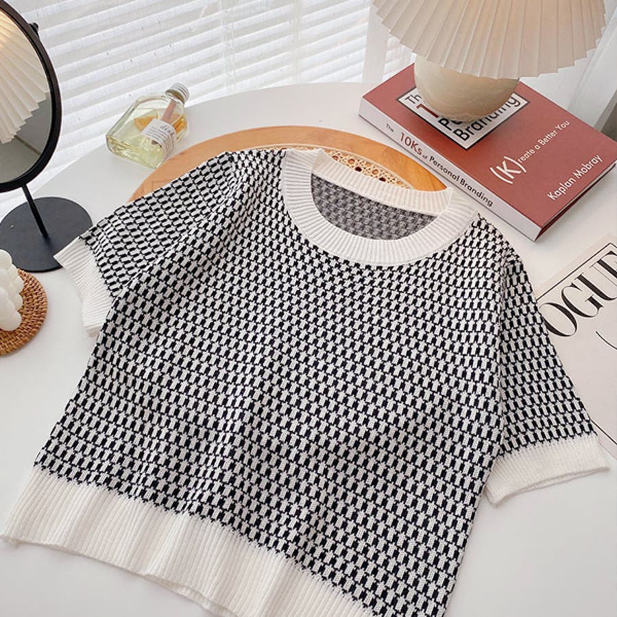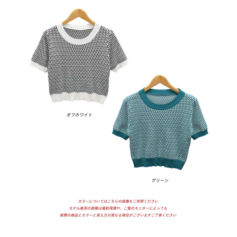 Y2K 春 春服 春コーデ 春ファッション スプリング スプリングコーデ 夏 夏コーデ 夏ファッション 夏服 カジュアル カジュアルコーデ 大人 大人カジュアル オフィスカジュアル オフィス オフィスファッション オフィススタイル クルーネック 韓国 韓国ファッション 韓国コーデ プチプラ プチプラファッション サマーニット リブ リブニット ニュアンスカラー 春カラー 春ニット 夏ニット クルーネック 5分袖 5分袖ニット ショート ショート丈 ジャガード ミニ コンパクト 白 黒 緑