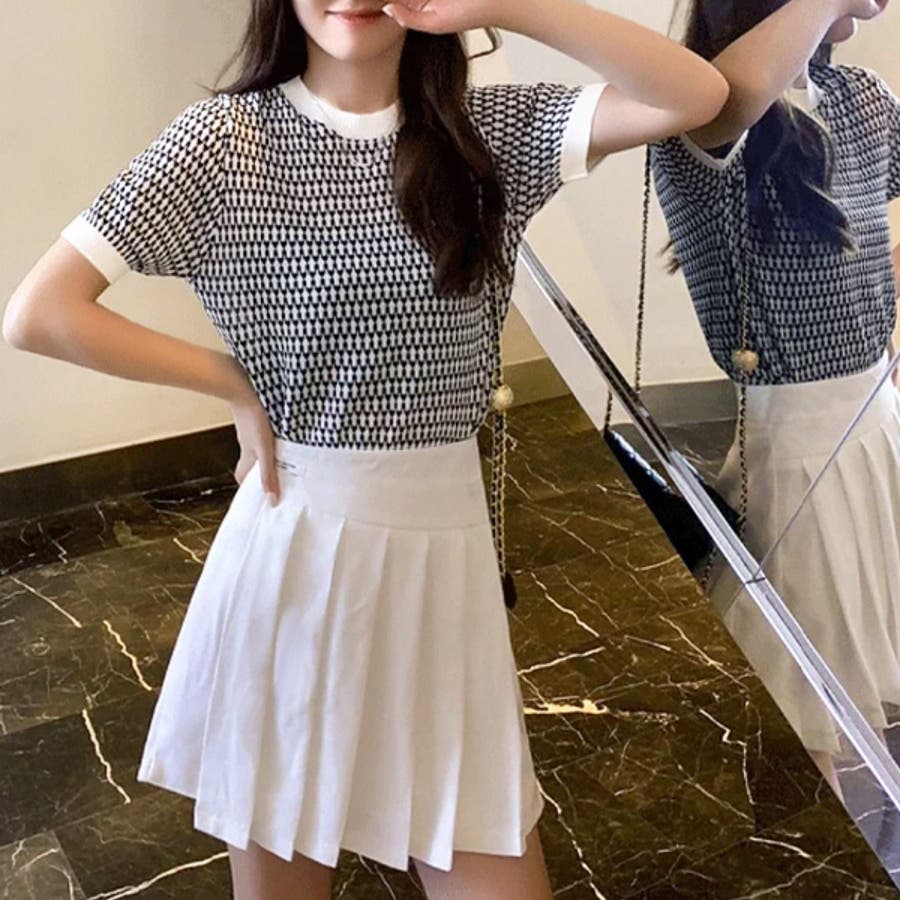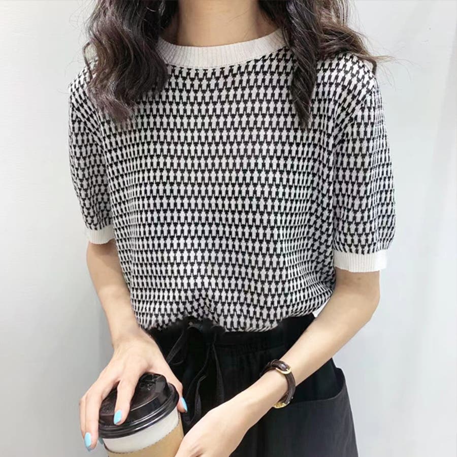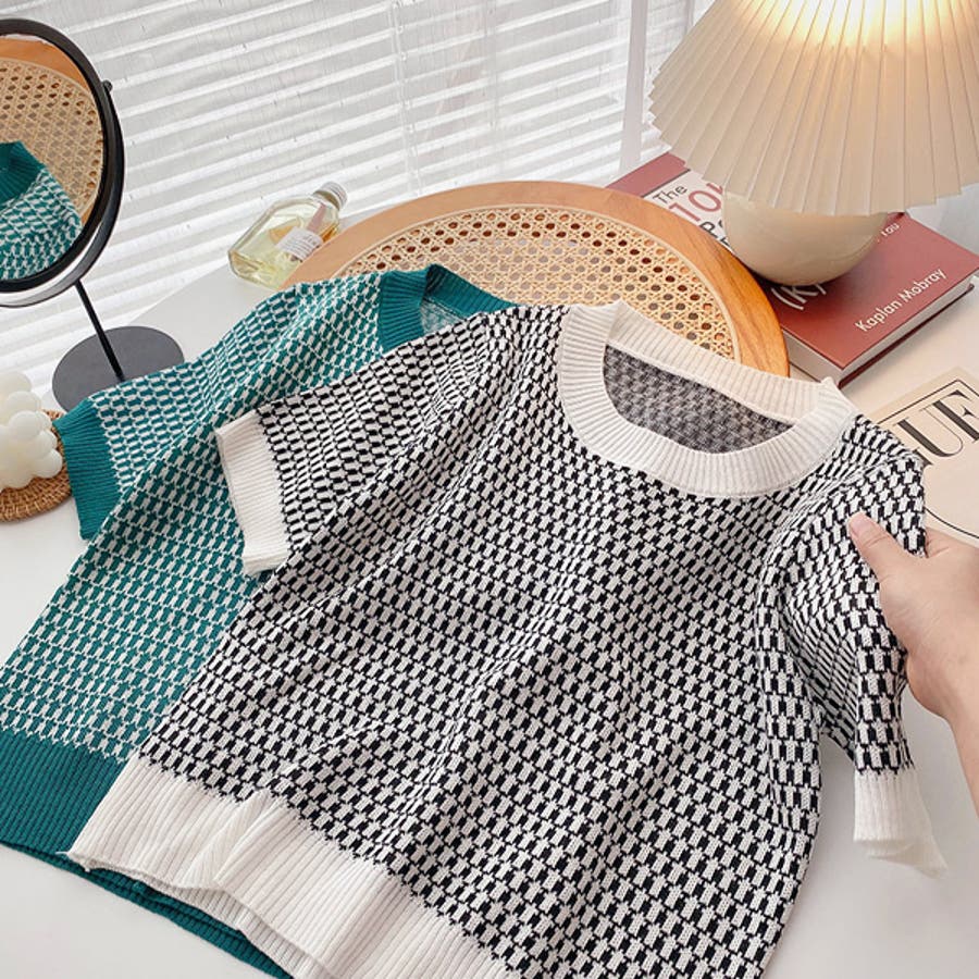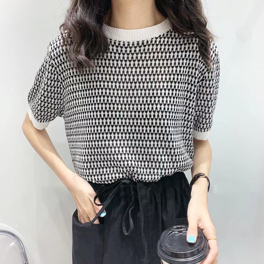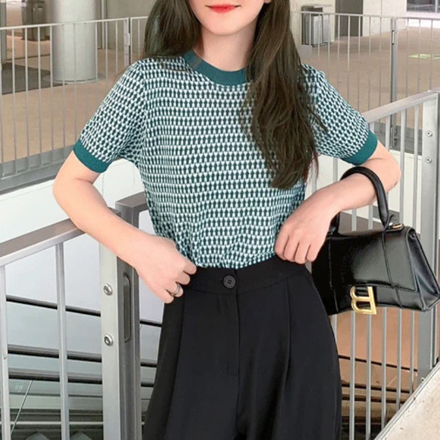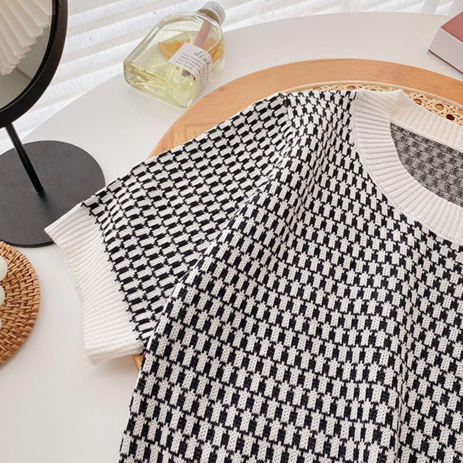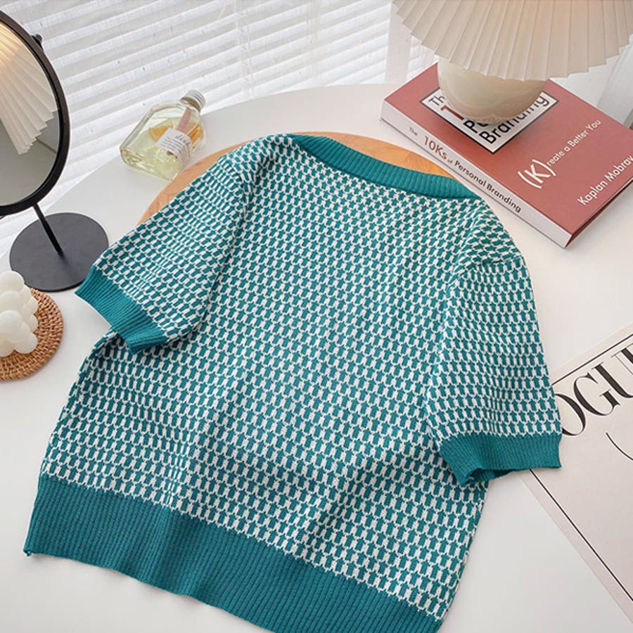 Y2K 春 春服 春コーデ 春ファッション スプリング スプリングコーデ 夏 夏コーデ 夏ファッション 夏服 カジュアル カジュアルコーデ 大人 大人カジュアル オフィスカジュアル オフィス オフィスファッション オフィススタイル クルーネック 韓国 韓国ファッション 韓国コーデ プチプラ プチプラファッション サマーニット リブ リブニット ニュアンスカラー 春カラー 春ニット 夏ニット クルーネック 5分袖 5分袖ニット ショート ショート丈 ジャガード ミニ コンパクト 白 黒 緑
