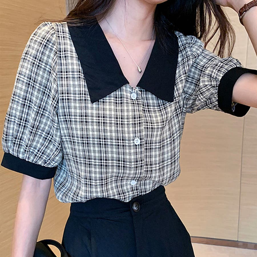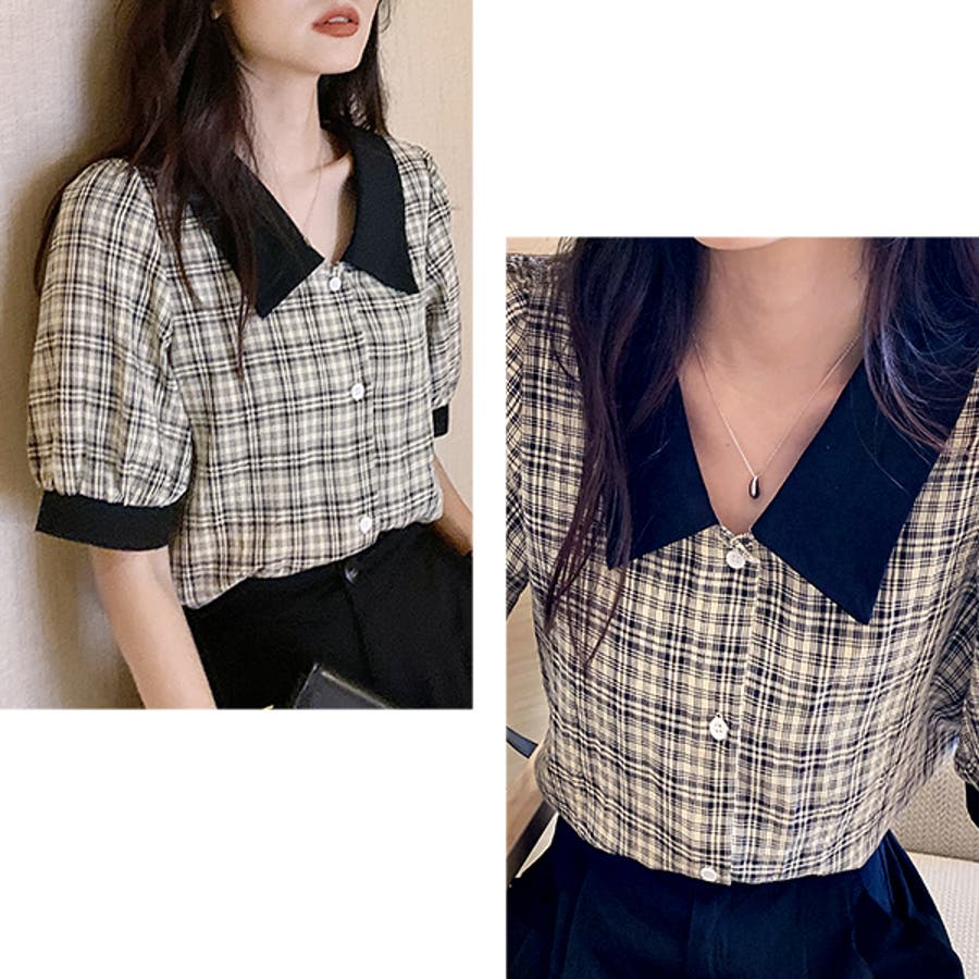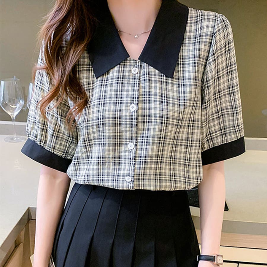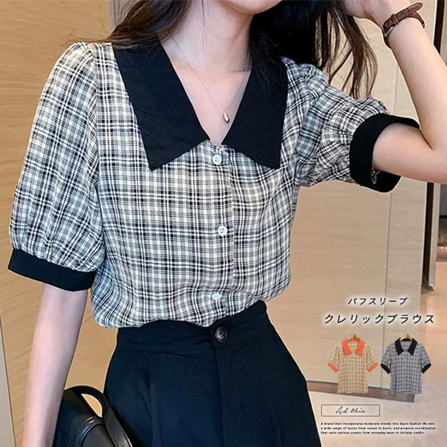 Y2K 夏 夏コーデ 夏ファッション 夏服 カジュアル カジュアルコーデ 大人 大人カジュアル オフィスカジュアル オフィス オフィスファッション オフィススタイル 韓国 韓国ファッション 韓国コーデ プチプラ プチプラファッション 夏トップス クレリックブラウス パフスリーブ パフスリーブブラウス ボリュームブラウス チェックブラウス 襟付きブラウス 配色ブラウス 黒 黒チェック キャメル