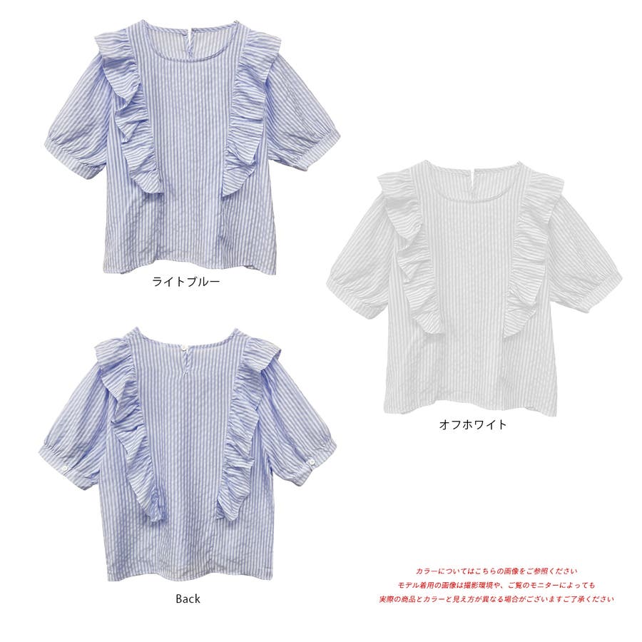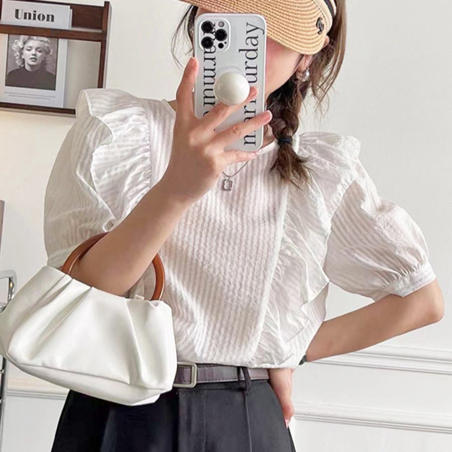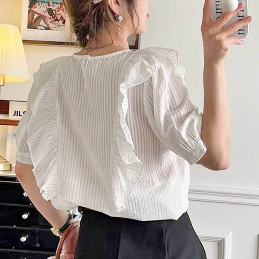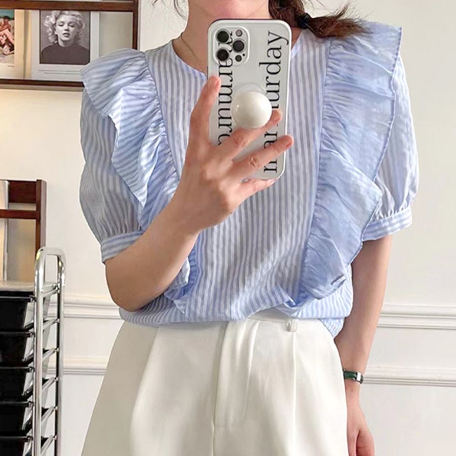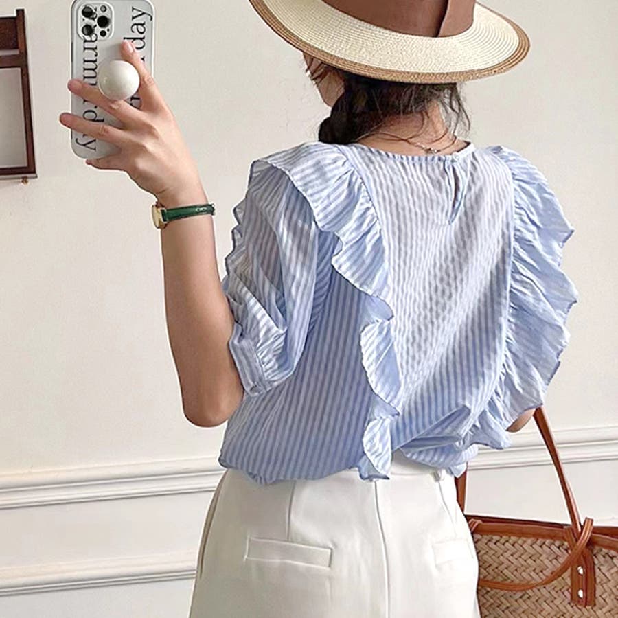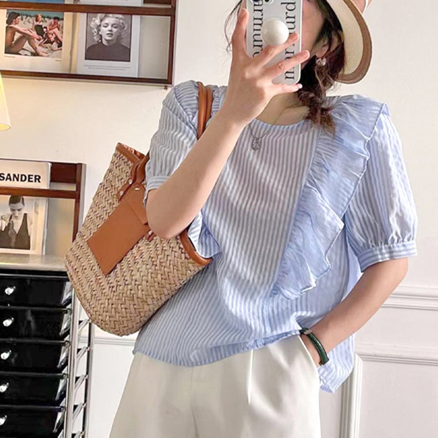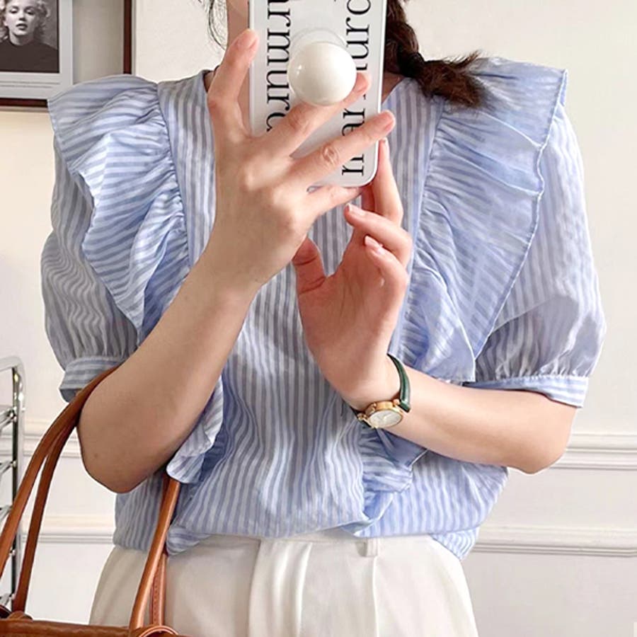 春 春コーデ 春ファッション 春服 夏 夏コーデ 夏ファッション 夏服 カジュアル カジュアルコーデ 大人 大人カジュアル オフィスカジュアル オフィス オフィスファッション オフィススタイル 韓国 韓国ファッション 韓国コーデ プチプラ プチプラファッション レディース Y2K 量産型 キレイめ 綺麗め きれい きちんと フリル フリルブラウス シアー シアーブラウス ストライプ ストライプ柄 ストライプブラウス パフスリーブ パフスリーブブラウス 半袖 半袖ブラウス 春のトップス ブラウス半袖 シアーストライプ フェミニン フェミニンコーデ フェミニンカジュアル オフ ホワイト 白 ブルー 青 ライトブルー