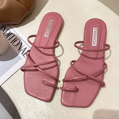 細めのストラップで華奢見せしてくれるカラーサンダル!